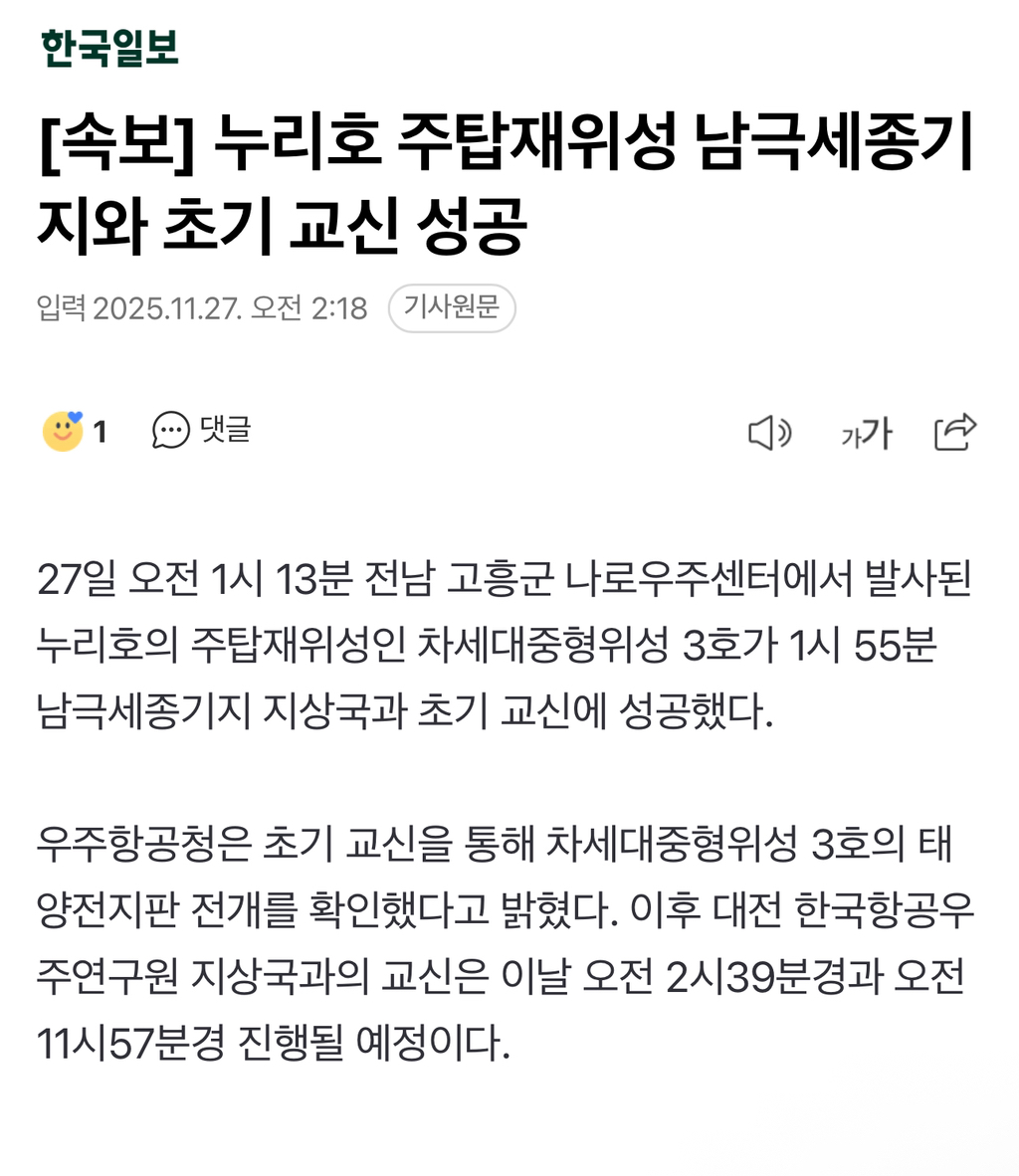 [여시뉴스데스크][속보] 누리호 주탑재위성 남극세종기지와 초기 교신 성공 작성자포항항항항항항항항|작성시간25.11.27|조회수12,930 목록 댓글 56 글자크기 작게가 글자크기 크게가 출처: https://n.news.naver.com/article/469/0000899787?type=breakingnews&cds=news_edit 다음검색 현재 게시글 추가 기능 열기 북마크 공유하기 신고 센터로 신고 댓글 댓글 56 댓글쓰기 답글쓰기 댓글 리스트 작성자월천만원수입있다 | 작성시간 25.11.27 멋지다 작성자제21대이재명대통령 | 작성시간 25.11.27 누리 잘 갔구나~~~~ 작성자나2026대박난대!! | 작성시간 25.11.27 누리최고!!!!! 작성자Rubencervantes | 작성시간 25.11.27 크으으으 작성자비눗방울 탕후루 | 작성시간 25.11.27 댓글 전체보기