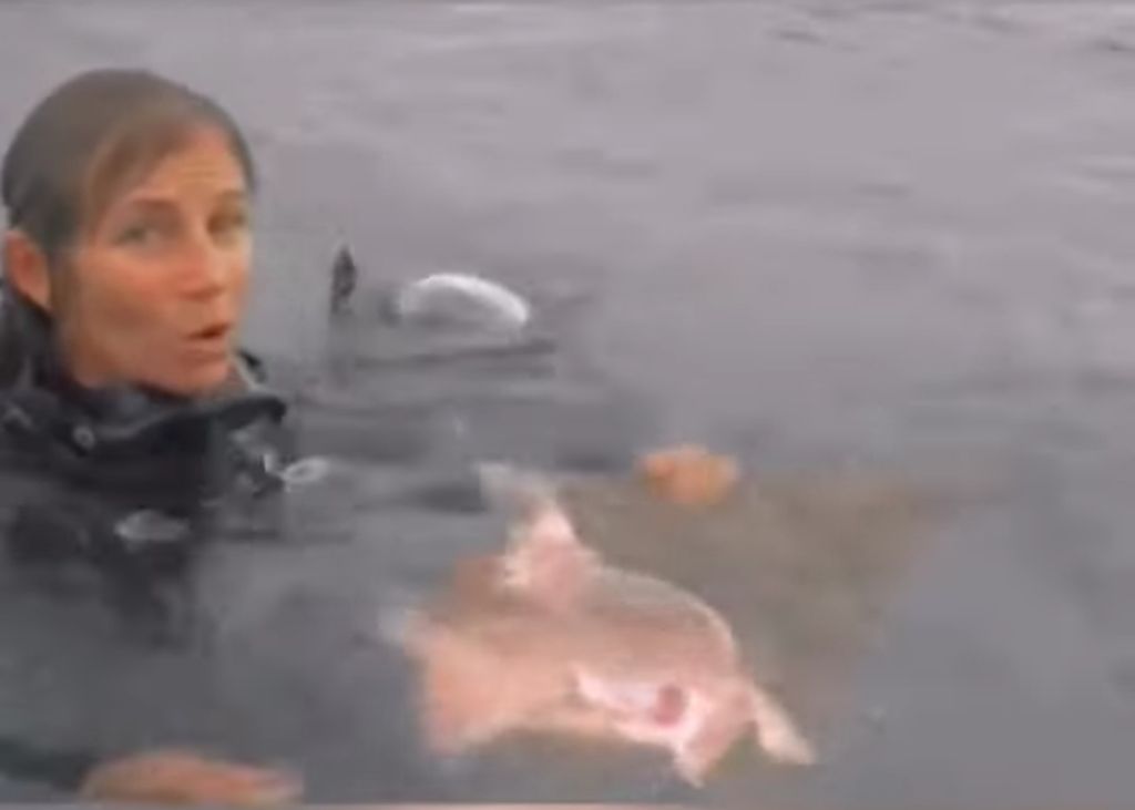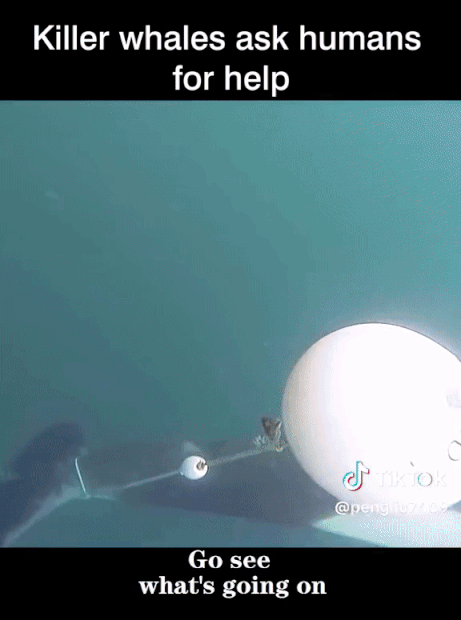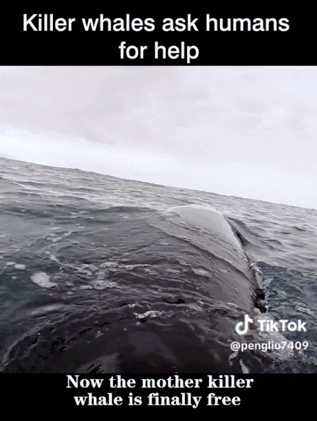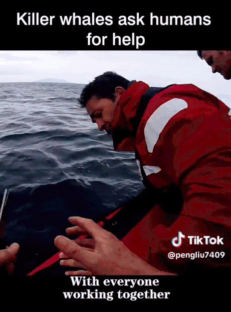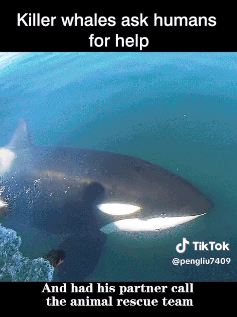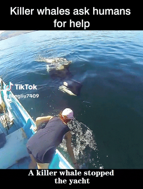 범고래가 요트로 다가와 무언가 신호를 보내는 듯한 행동을 함. 요트에 탄 사람은 범고래가 도움을 요청하고 있다는 것을 깨닫고 범고래에게 손을 뻗어 진정시킨 후 동물 구조대에 전화함