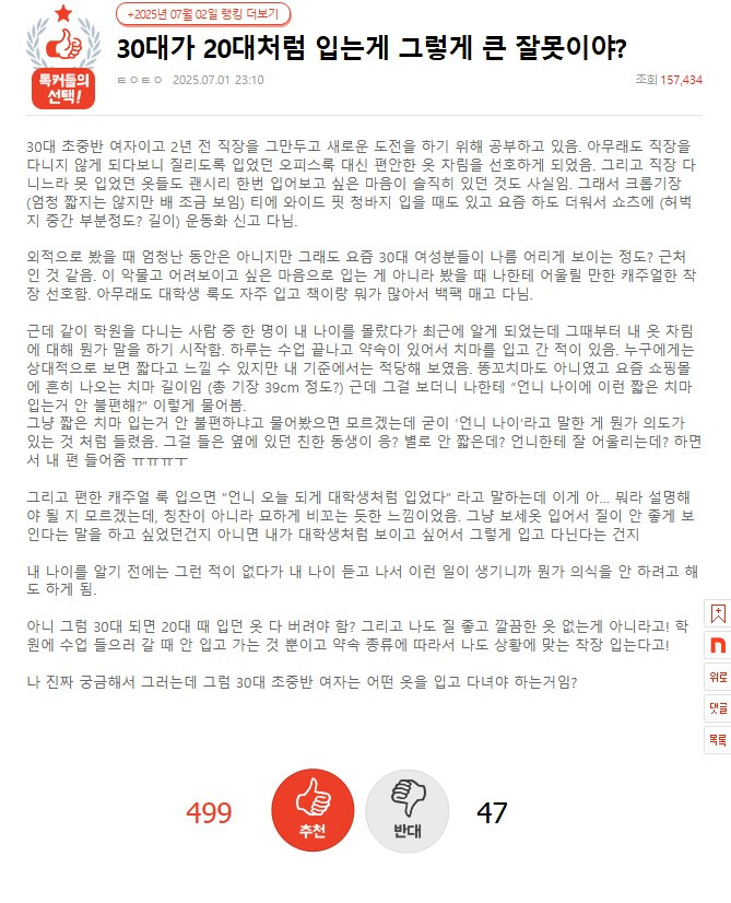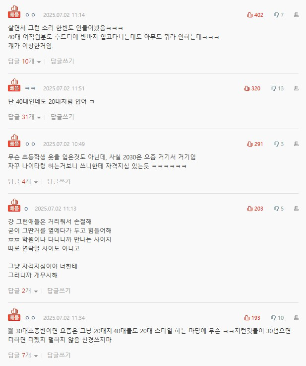 [스크랩] [흥미돋]30대가 20대처럼 입는게 그렇게 큰 잘못이야? 작성자가트몬귀여어|작성시간25.11.27|조회수43,962 목록 댓글 40 글자크기 작게가 글자크기 크게가 출처: 30대가 20대처럼 입는게 그렇게 큰 잘못이야? | 네이트 판 다음검색 스크랩 원문 : *여성시대* 차분한 20대들의 알흠다운 공간 현재 게시글 추가 기능 열기 북마크 공유하기 신고 센터로 신고 댓글 댓글 40 댓글쓰기 답글쓰기 댓글 리스트 작성자건강한똥강아지이나비 | 작성시간 25.11.27 난 초딩처럼 입고 다니는데 ㄷㄷ 작성자감자맛있으 | 작성시간 25.11.27 내가 뭘 입든말든 ㅜㅡ 작성자그렇게됐다고 | 작성시간 25.11.27 203040옷이 따로 있었어..? 스파브랜드 10대옷은 뭔지 알겠는데 2030은 뭐여 쟤 왜저래 작성자뿡캭카악테 | 작성시간 25.11.27 걍 좃대로 입읍시다 작성자뭐로할지몰라요 | 작성시간 25.11.27 20대때 입던거 걍 입는거라구요ㅠ 나이가 든거에요 댓글 전체보기