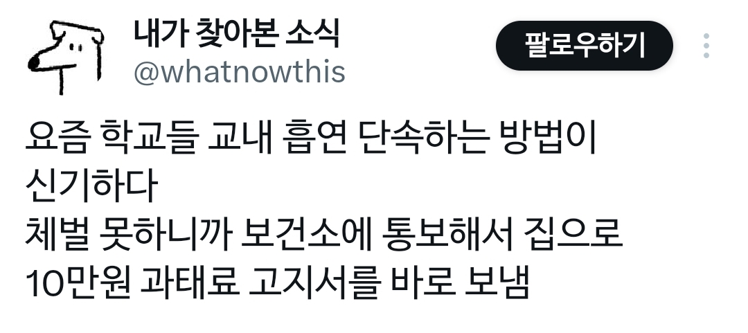 [흥미돋]요즘 학교가 청소년흡연에 대해 대처하는 방식 작성자COPY BARA|작성시간25.11.27|조회수17,733 목록 댓글 50 글자크기 작게가 글자크기 크게가 출처: https://x.com/whatnowthis/status/1993664014006833636?t=Kjv_kKEEiSGvi9lCnf5DeQ&s=19과태료 먹이기 다음검색 현재 게시글 추가 기능 열기 북마크 공유하기 신고 센터로 신고 댓글 댓글 50 댓글쓰기 답글쓰기 댓글 리스트 작성자옴뇨뇸 | 작성시간 25.11.27 저게 맞다 ㅋㅋㅋ 그래야 부모도 심각성을 알 듯 ㅋㅋㅋ 작성자아이스아메리카노시럽추가 | 작성시간 25.11.27 ㅋㅋㅋㅋㅋㅋㅋ이거맞닼ㅋㅋ 작성자도라에몽팥빵 | 작성시간 25.11.27 굿 ㅎ 작성자랑해사 | 작성시간 25.11.27 헐 좋은데 작성자하는일마다 잘되는여시 | 작성시간 25.11.28 굿~~~ㅋㅋㅋ 댓글 전체보기