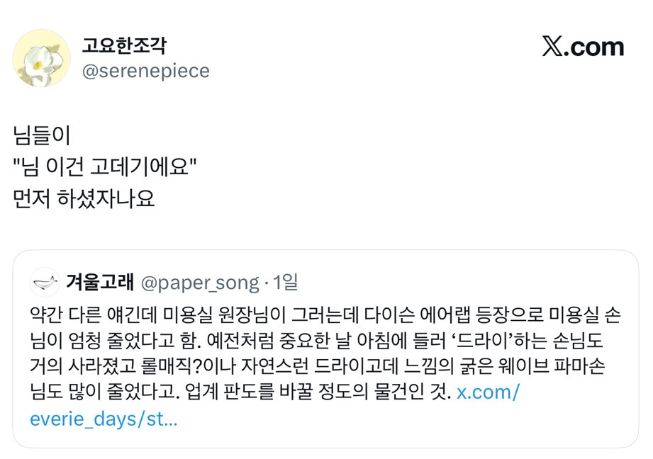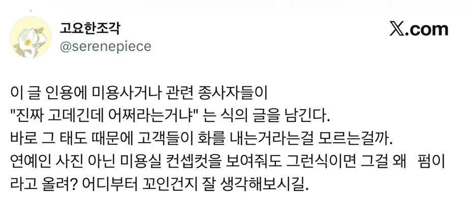 개인적으로 미용실도 핑텍 대표 주자+가격은 비싸게 받아먹는데 서비스구림, 소비자 탓하기 개심해서 별로 안가고 안좋아했는데 이거 보고 속이 다 시원해짐