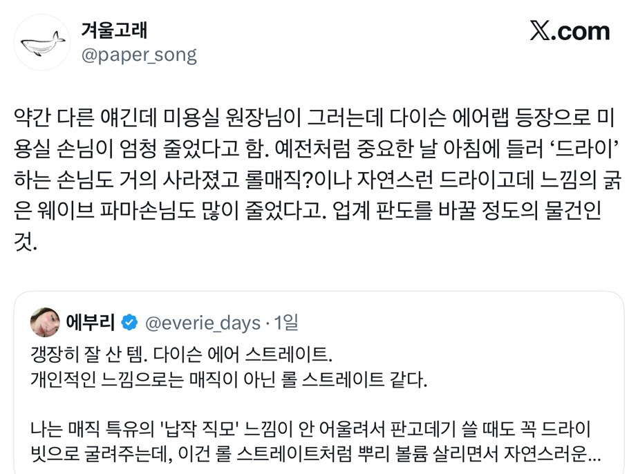 작성자한국어 가능한 오타니 강아지 작성시간 25.11.27 비싼 돈 내고 한 파마도 몇달 안 가고 파마하고 나서도 머리 말릴 때마다 손질해주라는데 별 의미 없어보여서 걍 다이슨만 씀…일년에 딱 한번 상한 머리만 자름