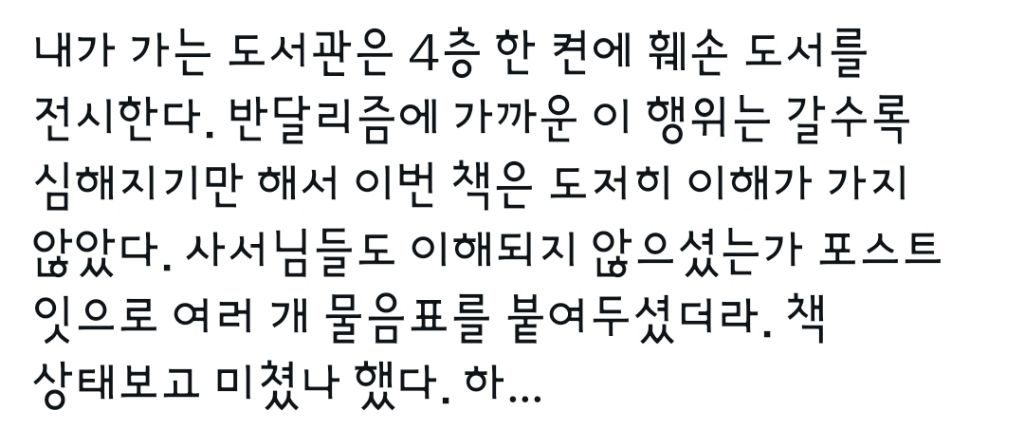 작성자아아메광인 작성시간 25.11.27 누군지 잡아내기가 어려운게 우선 반납되는 모든책 내부를 확인할 수 없고, 언젠가 발견하면 언제 낙서가 됐는지 특정하기 어렵고, 대출하지않고 도서관에서 읽으면서 저렇게 하는사람도 있어서.. 잡아내기가 어려워... 휴...