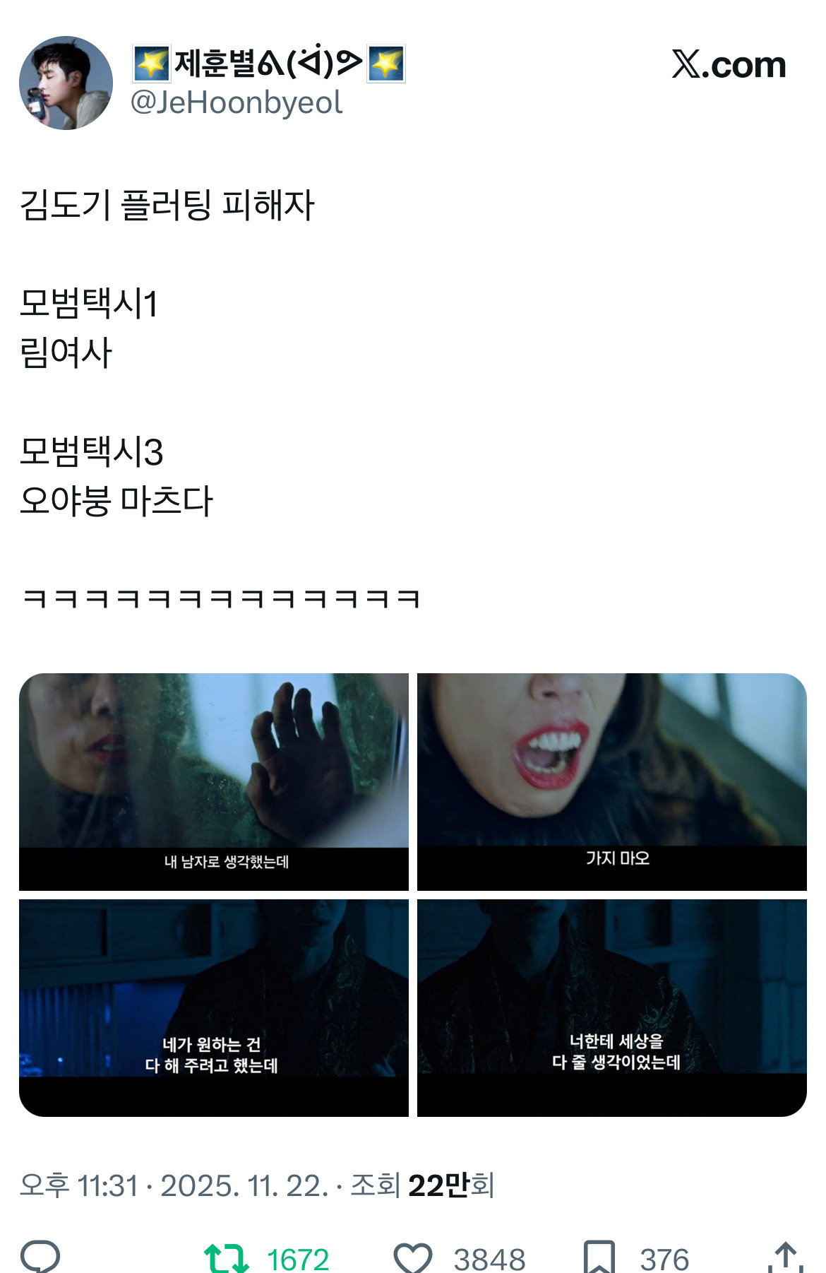[흥미돋]드라마 모범택시 김도기 플러팅 피해자.twt 작성자Egypt|작성시간25.11.27|조회수29,708 목록 댓글 28 글자크기 작게가 글자크기 크게가 출처: https://x.com/jehoonbyeol/status/1992239394934464676?s=46 왕따오지에게 당한 림여사왜따오지에게 당한 오야붕 (;;세상 ㅇㅈㄹ) 다음검색 현재 게시글 추가 기능 열기 북마크 공유하기 신고 센터로 신고 댓글 댓글 28 댓글쓰기 답글쓰기 댓글 리스트 작성자고대휘 | 작성시간 25.11.27 왜따오지ㅅㅂㅋㅋㅋㅋㅌㅋㅌㅌㅌㅋㅋㅋㅋㅋㅋㅋㅋㅋㅋㅋㅋㅋ 작성자Be our Guest | 작성시간 25.11.27 왜따오짘ㅋㅋㅋㅋㅋ 작성자찰푸덕 찰푸덕 | 작성시간 25.11.27 왜따오지개웃기네 아직 저거까지만 나왔더라 시즌3다나온지 알고 계속볼라고했더니ㅋㅋㅋㅋㅋㅋㅋㅋㅋ 작성자Ffori | 작성시간 25.11.27 아 개웃곀ㅋㅋㅋㅋㅋㅋㅋㅋㅋ 작성자개크보 개롯데 | 작성시간 25.11.29 왜따오지 진짜 개웃기다ㅋㅋㅋㅋㅋㅋㅋㅋㅋㅅㅂ 댓글 전체보기