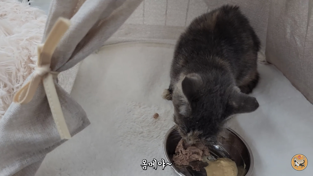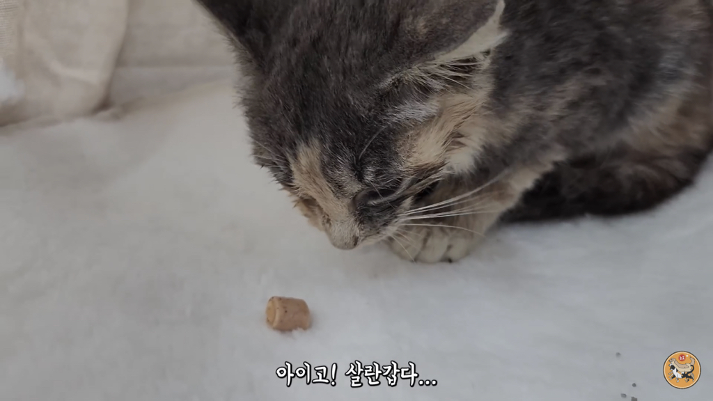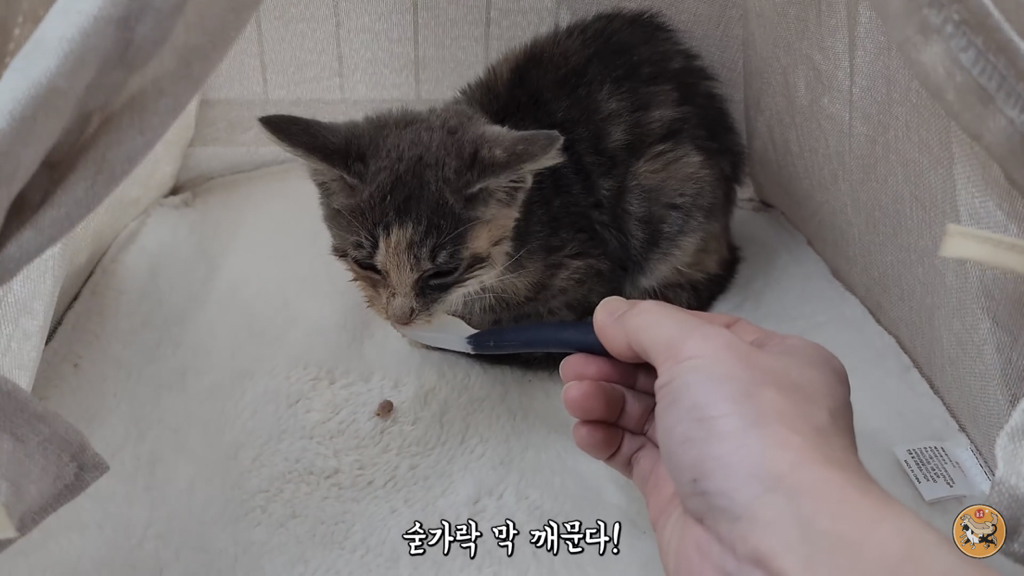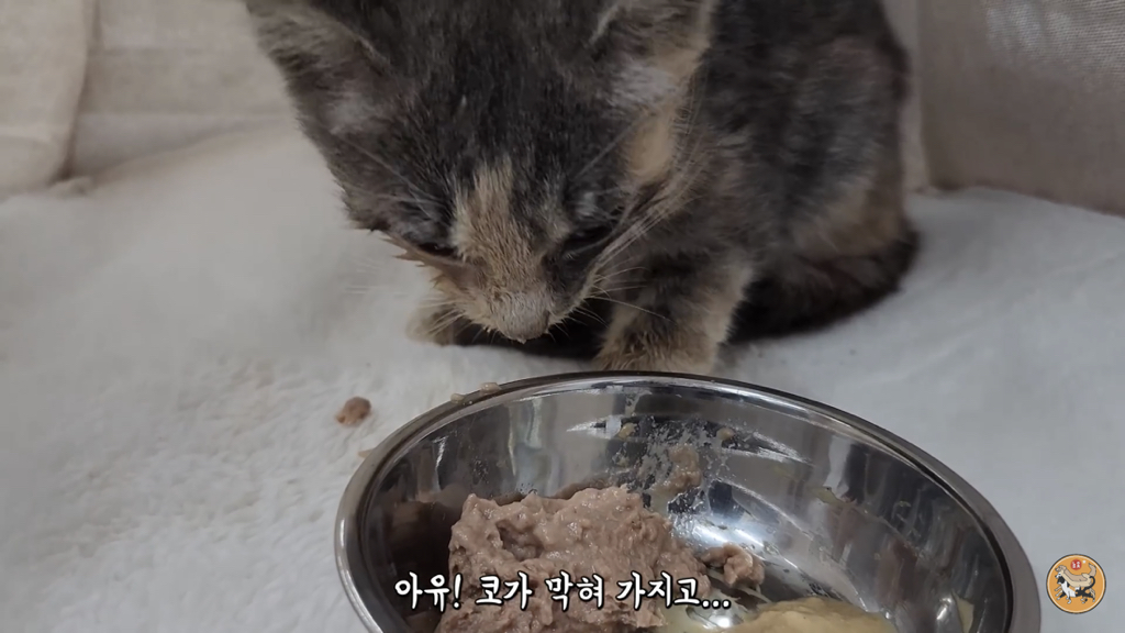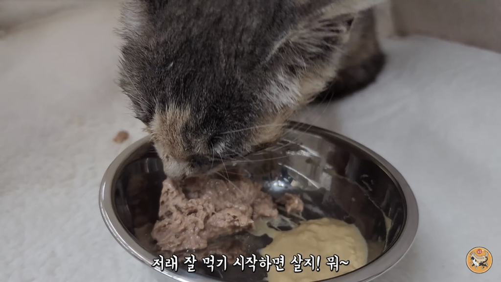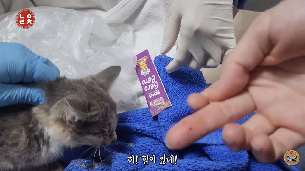입 안에 굳어있던 사료를 빼고 츄르를 주니 제법 받아먹음