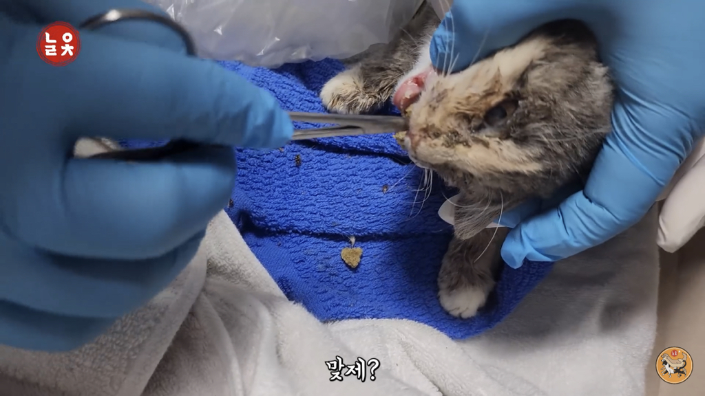 고양이가 상태가 안좋았던 이유 중 하나는 입 안 가득 찬 사료 때문…