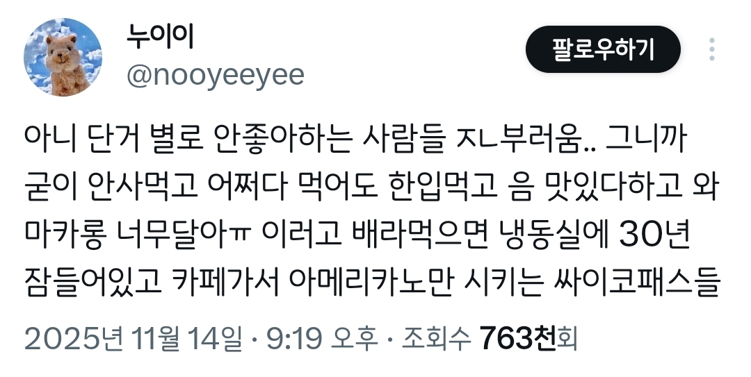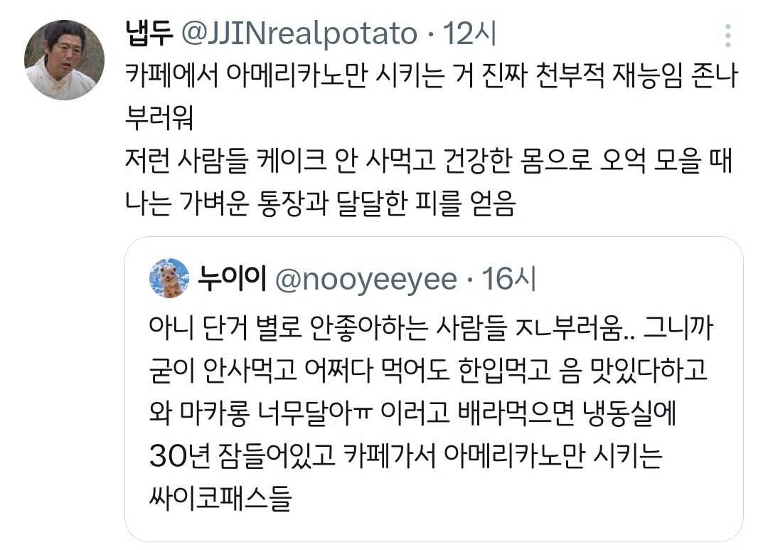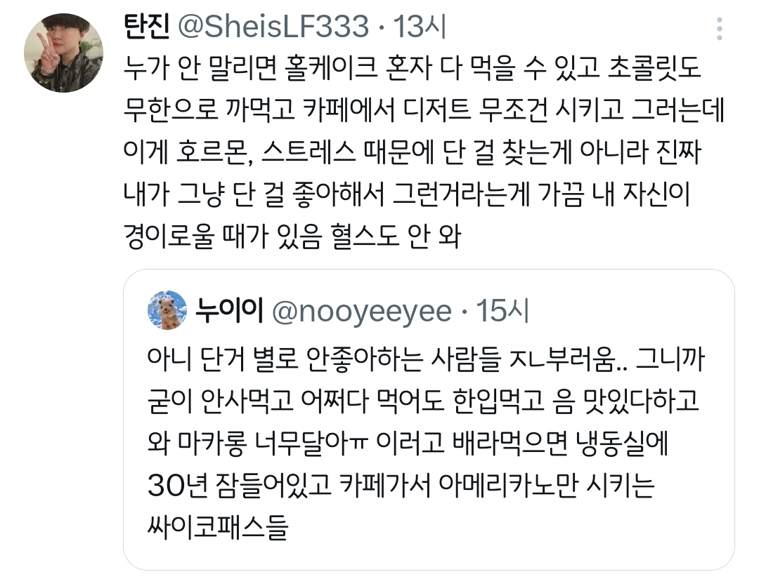 작성자Jin Yun 작성시간 25.11.28 첫 트윗보고 흠칫함 나 단거 안먹는데 알코올중독임;;;;;