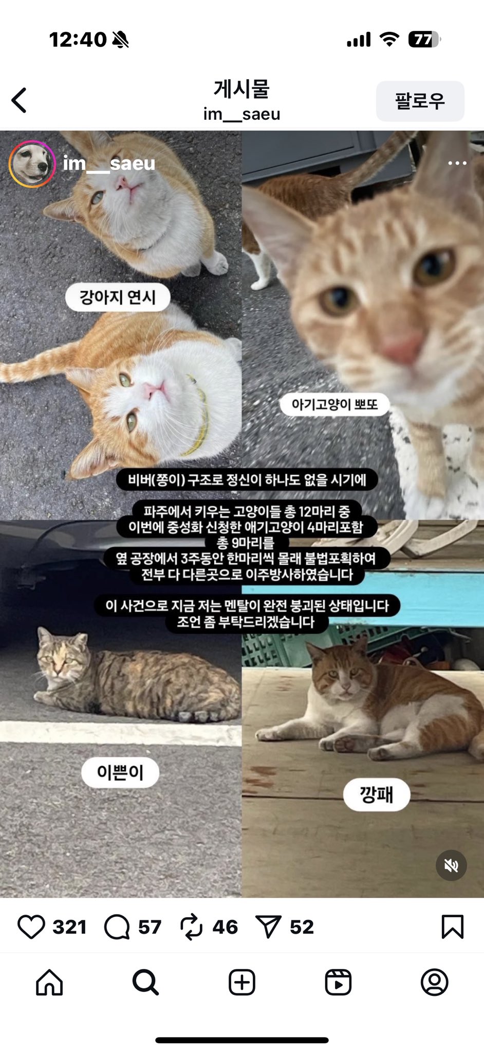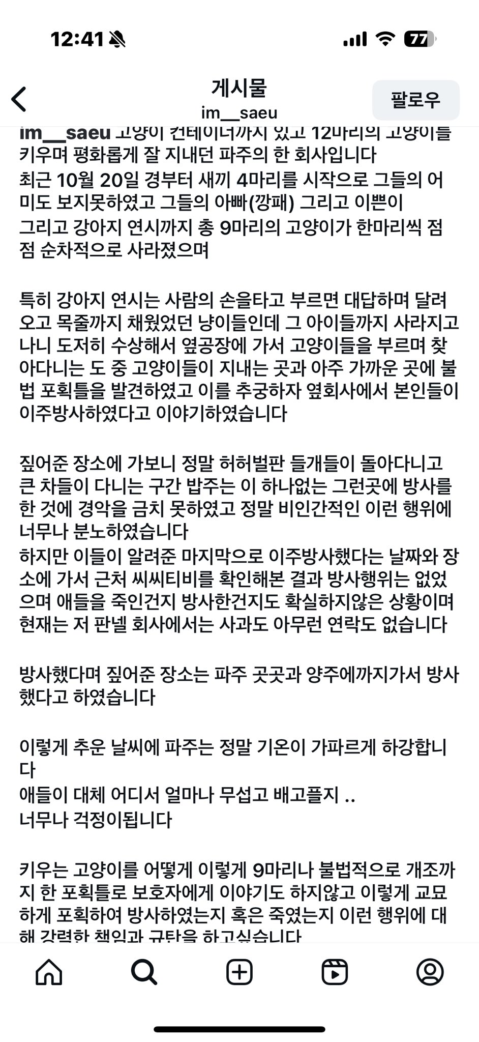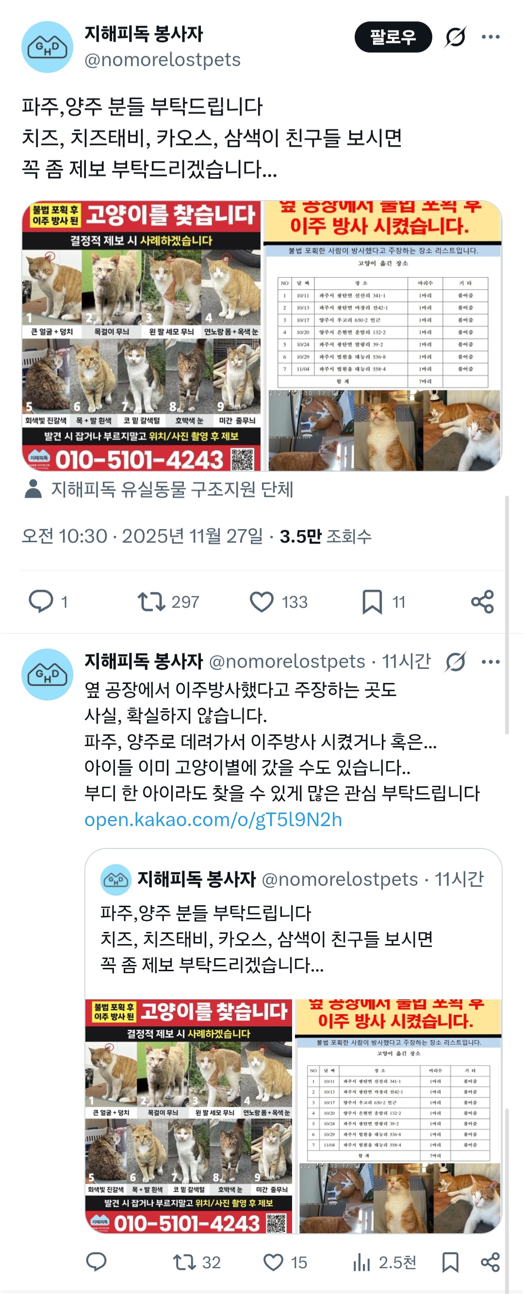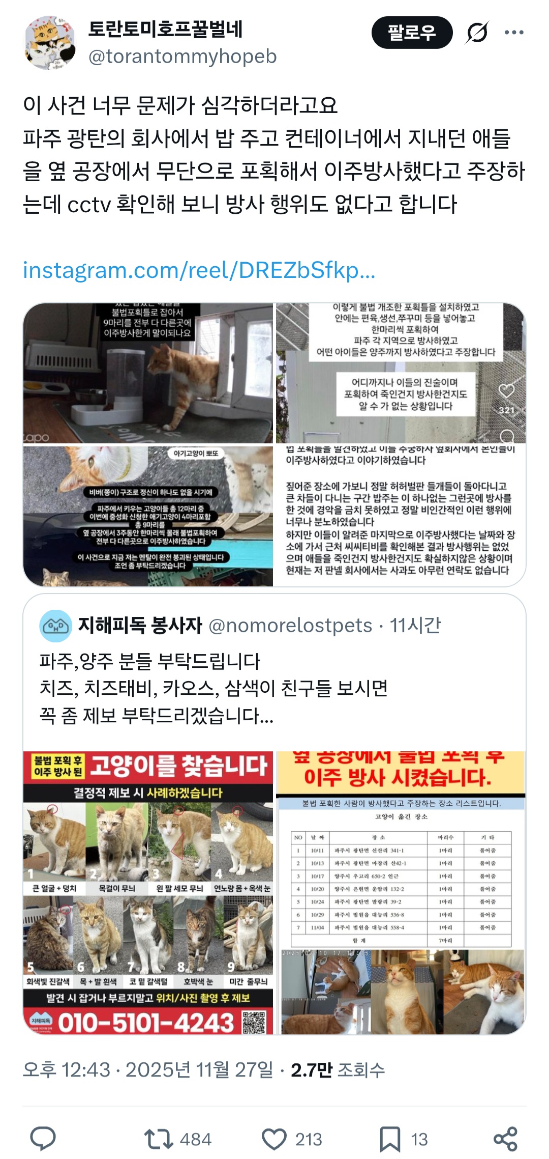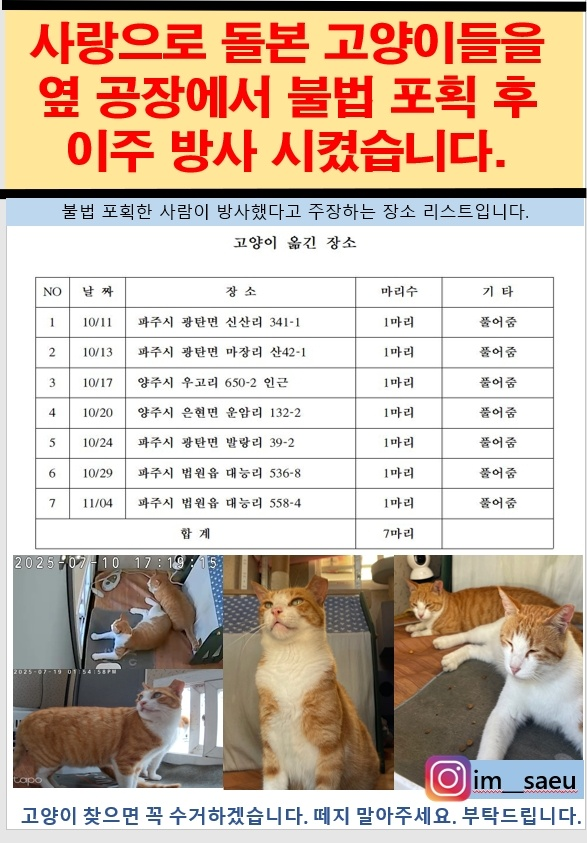 [기타]파주,양주 분들 부탁드립니다 치즈, 치즈태비, 카오스, 삼색이 친구들 보시면 꼭 좀 제보 부탁드리겠습니다...twt 작성자냥냥펀치°|작성시간25.11.27|조회수5,454 목록 댓글 43 글자크기 작게가 글자크기 크게가 출처: https://x.com/torantommyhopeb/status/1993888394485895189?t=viEmGZzOlueIl54ajjAq9A&s=19 다음검색 현재 게시글 추가 기능 열기 북마크 공유하기 신고 센터로 신고 댓글 댓글 43 댓글쓰기 답글쓰기 댓글 리스트 작성자암어링고링고 | 작성시간 25.11.28 미친놈 작성자오 요 쪼 | 작성시간 25.11.28 매일같이 동물학대구나 작성자꽃사슴꺼져 | 작성시간 25.11.28 인스타보니까 계속 저 짓햇고 동물에 대해 잘 몰라서 그랫다고 그랏대 국민 신문고에 민원 넣어달라고 하셔 이미지 확대 작성자일찍자자제발요 | 작성시간 25.11.28 정말 죽여버리고싶어 졸라 한심한 인생 ㅅㅂ 작성자동물학대범한테살날려서죽임 | 작성시간 25.12.03 하....날씨도 진짜 너무추운데 어떡해 제발 댓글 전체보기