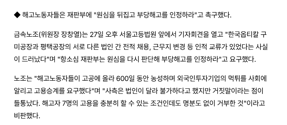 [여시뉴스데스크]한국옵티칼 '부당해고' 항소심...구미→평택 공장 '고용승계' 해석 놓고 공방 작성자바오바바밥|작성시간25.11.27|조회수2,015 목록 댓글 1 글자크기 작게가 글자크기 크게가 출처: https://www.pn.or.kr/news/articleView.html?idxno=32906한국옵티칼 '부당해고' 항소심...구미→평택 공장 '고용승계' 해석 놓고 공방경북 구미 한국옵티칼 해고노동자들이 사측이 '부당해고'를 했다며 2년 반 동안 긴 싸움을 벌이고 있다.지방노동위원회와 중앙노동위원회까지 찾아가 다퉜지만, 노동자들의 손을 잡아주지 않았www.pn.or.kr 전문출처 다음검색 현재 게시글 추가 기능 열기 북마크 공유하기 신고 센터로 신고 댓글 댓글 1 댓글쓰기 답글쓰기 댓글 리스트 작성자바오바바밥 작성자 본인 여부 작성자 | 작성시간 25.11.27 KBS 다큐인사이트에서 한국옵티칼 나오길래 기사 가져왔어요 댓글 전체보기