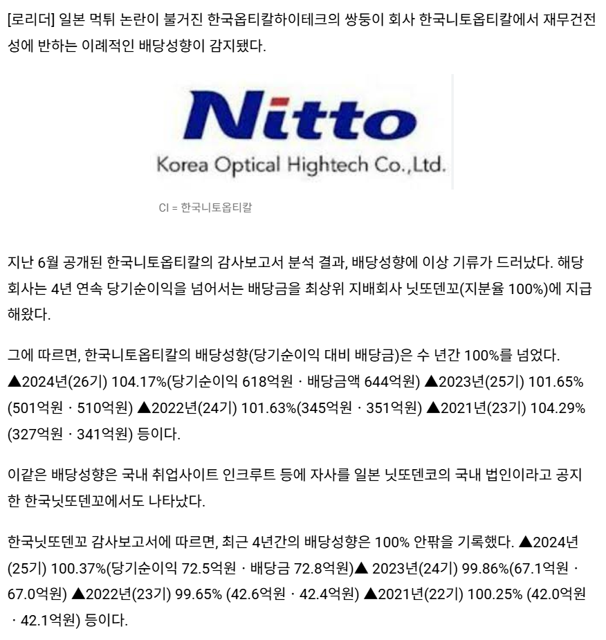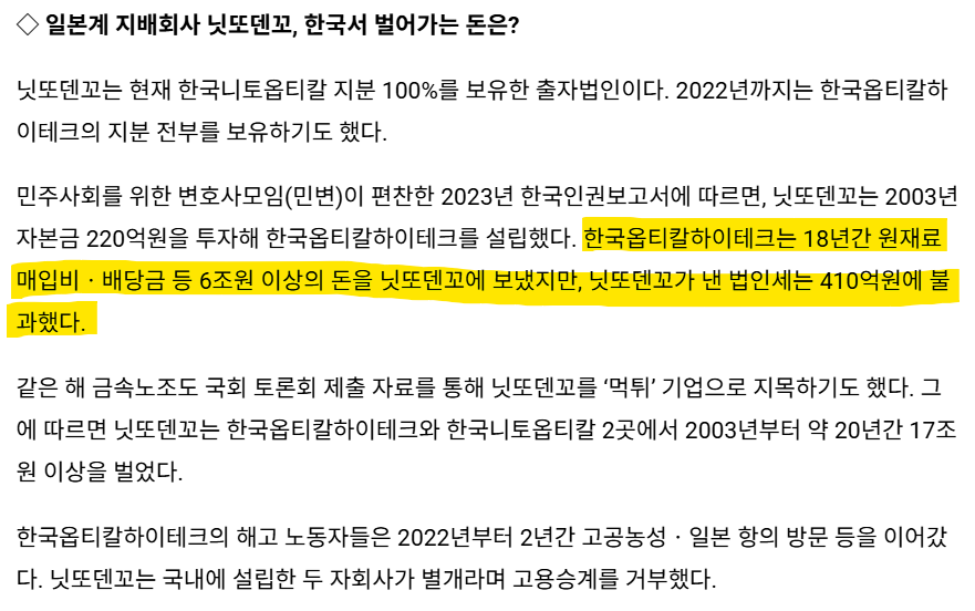 아직 한국에 있는 한국니토옵티칼, 한국 닛또덴코에서 아직도 돈 빼가고있음