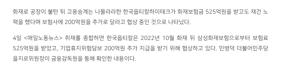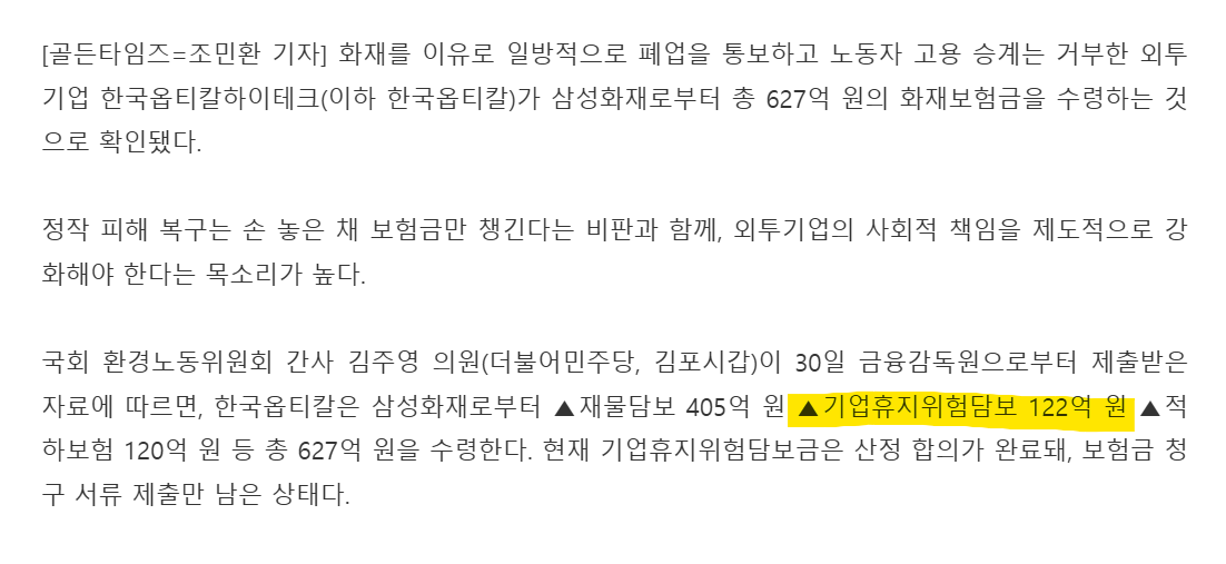 2022년에 한국옵티칼 공장에서 화재났던거 기억해?