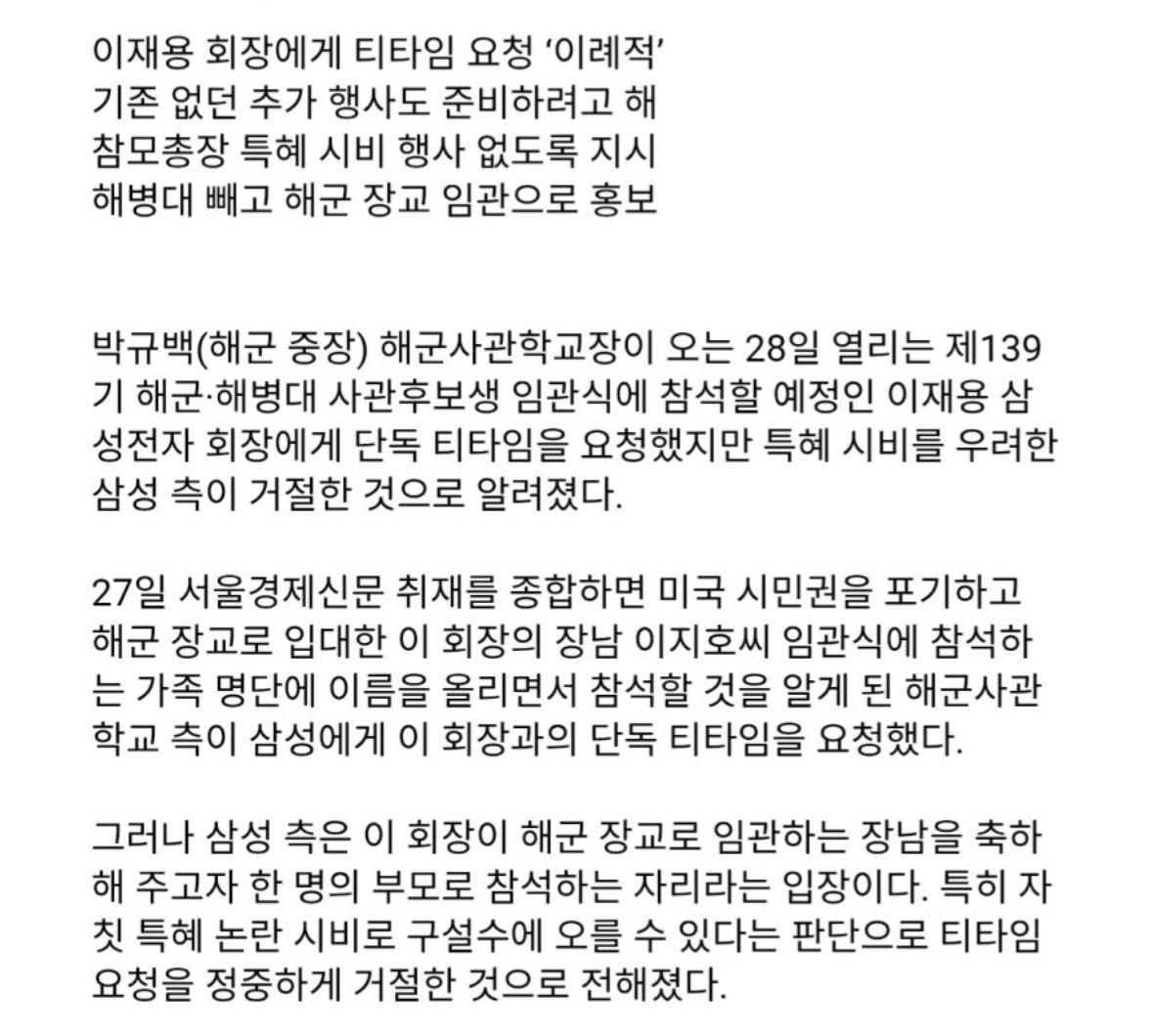 이재용 아들이 해군장교로 입대해서 (부모로서) 임관식 보러갈 예정 -> 교장이 단독 티타임 요청 -> 삼성측에서 거절