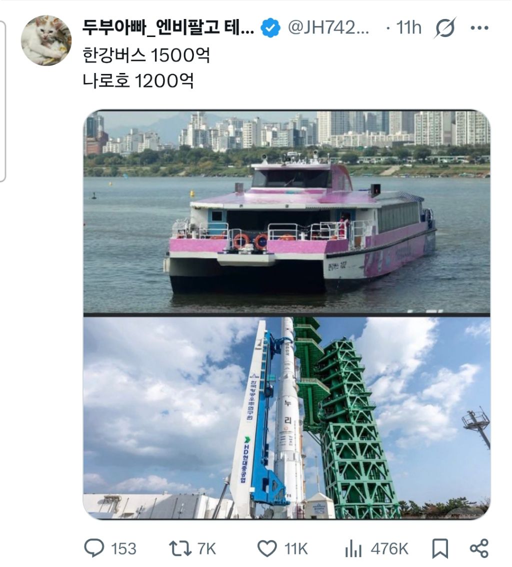 [기타]한강버스 누리호 작성자외숙모|작성시간25.11.28|조회수15,690 목록 댓글 67 글자크기 작게가 글자크기 크게가 출처: 여성시대 외숙모 https://m.cafe.daum.net/subdued20club/ReHf/5508138?svc=cafeapp??? 1500억 vs 누리호 1200억출처: https://x.com/jh74223029/status/1993888922305483017?s=46t=O0dhQ_0ijmrhSk9gvFWbiAX의 두부아빠_엔비팔고 테슬라사라님(@JH74223029)한강버스 1500억 나로호 1200억x.com저 뭣같은 핑크색실제 누리호 발사 금액은 12년m.cafe.daum.net 다음검색 현재 게시글 추가 기능 열기 북마크 공유하기 신고 센터로 신고 댓글 댓글 67 댓글쓰기 답글쓰기 댓글 리스트 작성자건.들.기.만.해.봐 | 작성시간 25.11.28 이거 감사해야하는거 아님? 작성자Yacht | 작성시간 25.11.28 이거 조사하라고 아욕나와 작성자dirbcjwl | 작성시간 25.11.28 나진짜홧병날것같아 작성자쪼꼬소라빵 | 작성시간 25.11.28 누가 한강버스 만들어달랬냐고 ㅅㅂ 작성자왤케화냄 | 작성시간 25.11.28 씨발 미칫아 댓글 전체보기