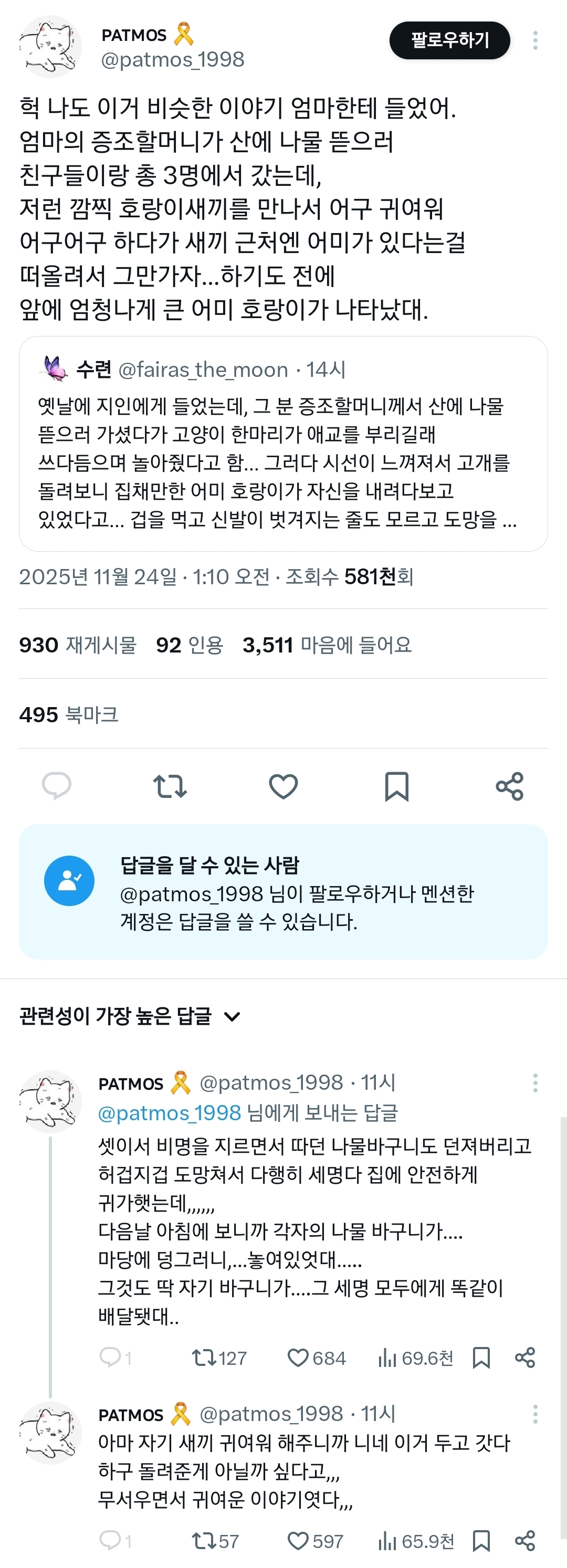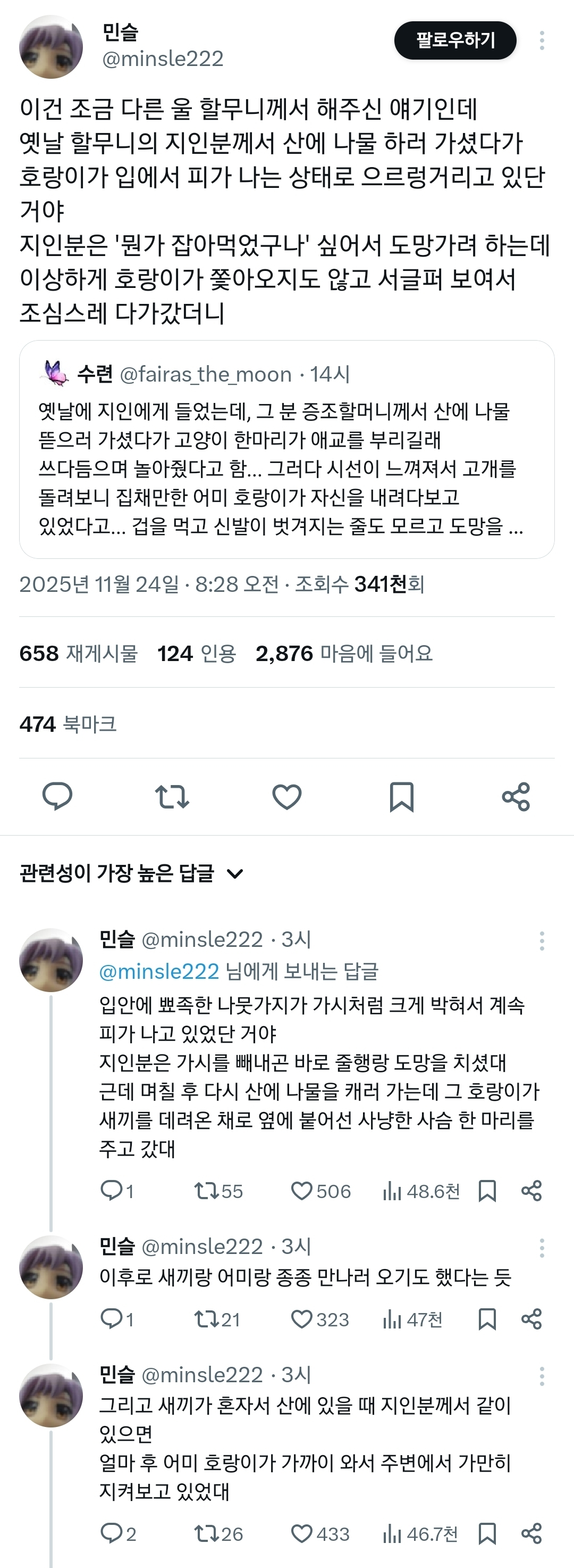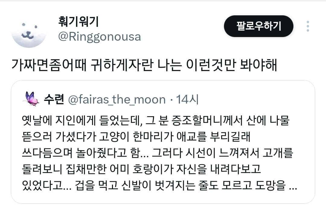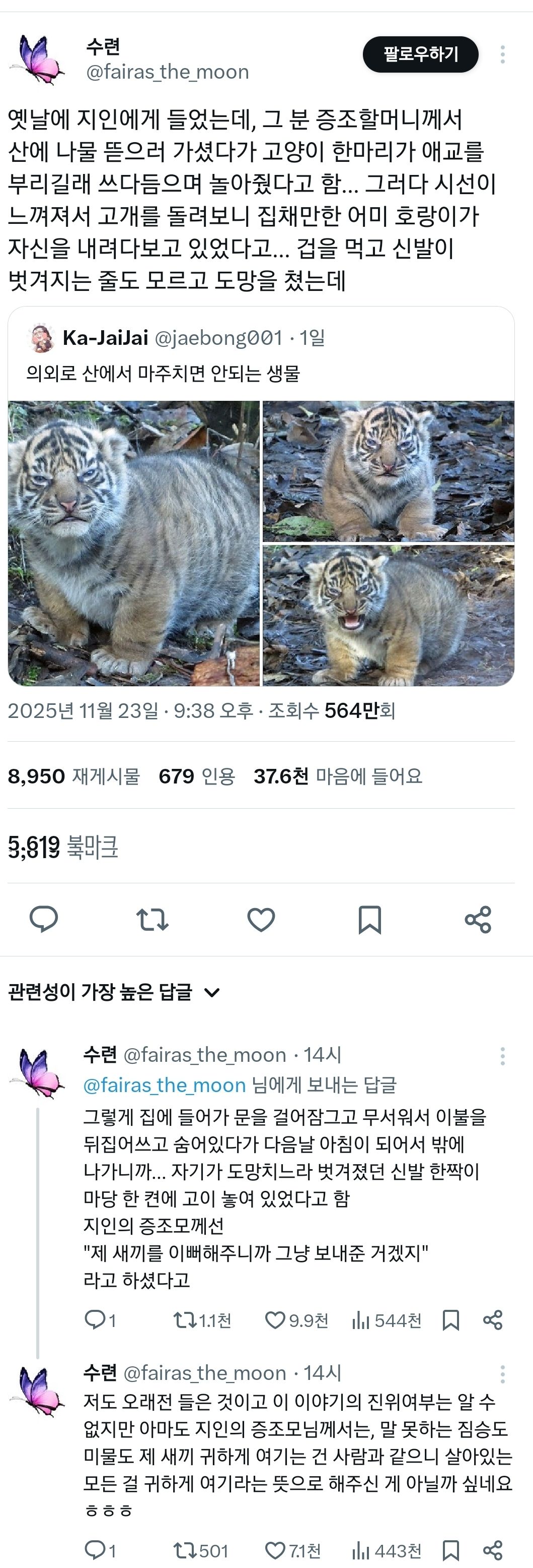 작성자BooLovesStoneee 작성시간 25.12.20 나도 친할머니한테 들었는데 친할머니의 어머니가 산에 나물 캐러 가셨다가 새끼호랑이가 있길래 넘 귀여워서 놀아주고 예뻐해줬대 아마 주변에 어미 호랑이 있었을거라고.. 근데 지새끼 예뻐하니까 공격 안한 것 같다고 하셨어