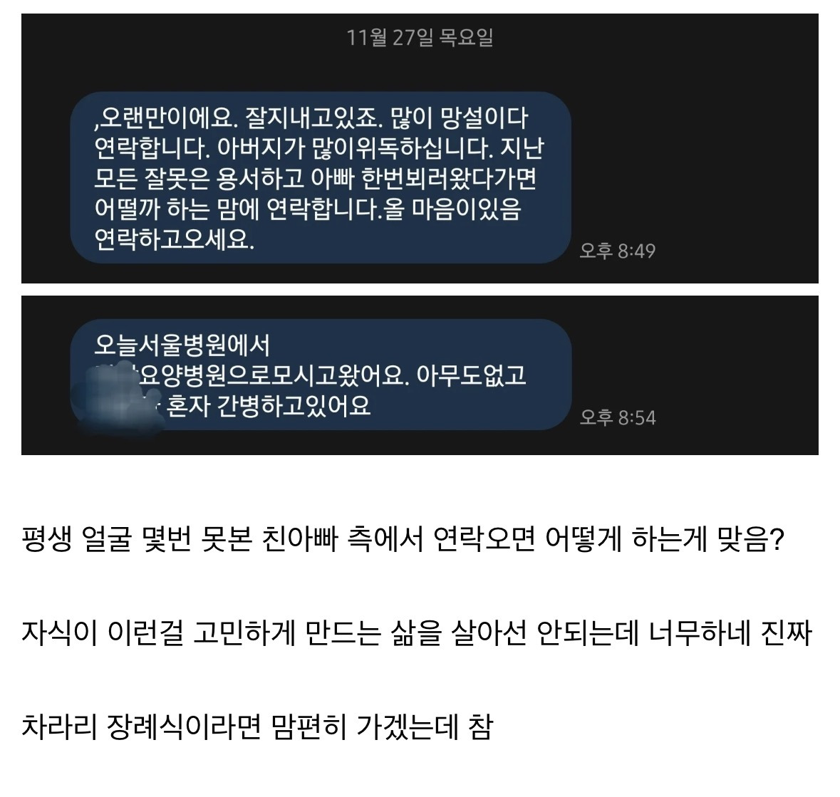[흥미돋]평생 몇번 연락없던 친 아빠의 소식 작성자Sunmoonstar02|작성시간25.11.28|조회수37,892 목록 댓글 195 글자크기 작게가 글자크기 크게가 출처: https://www.dogdrip.net/672221316평생 몇번 연락없던 친 아빠의 소식 - DogDrip.Net 개드립평생 얼굴 몇번 못본 친아빠 측에서 연락오면 어떻게 하는게 맞음? 자식이 이런걸 고민하게 만드는 삶을 살아선 안되는데 너무하네 진짜 차라리 장례식이라면 맘편히 가겠는데 참www.dogdrip.net 다음검색 현재 게시글 추가 기능 열기 북마크 공유하기 신고 센터로 신고 댓글 댓글 195 댓글쓰기 답글쓰기 댓글 리스트 작성자여자누리 | 작성시간 25.11.29 ㅈ까 작성자함냥함냥 | 작성시간 25.11.29 너 뭐돼? ㅋ 작성자ㄱㅏㅈㅣ | 작성시간 25.11.29 고민할 필요도 없지ㅜㅜ 례식에나 불러달라 답장 ㄱ 작성자북극성전지현 | 작성시간 25.11.29 누구신데용서하라마라 지랄이지 작성자부메리카노 | 작성시간 25.11.29 너뭔데????? 절대안가지 댓글 전체보기