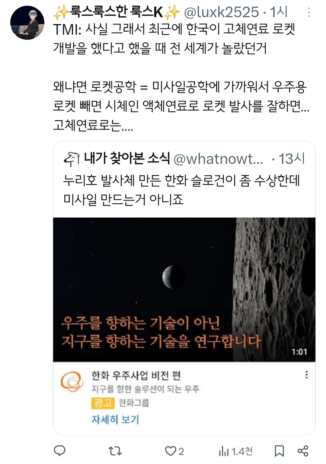 [스크랩] [흥미돋]누리호 발사체 만든 한화 슬로건이 좀 수상한데.twt 작성자Tory-|작성시간25.11.28|조회수35,828 목록 댓글 45 글자크기 작게가 글자크기 크게가 출처: 여성시대 열세걸음https://x.com/whatnowthis/status/1993849775213695234?t=kRSXg8zSHrKtv_If3_rKqg&s=19X의 내가 찾아본 소식님(@whatnowthis)누리호 발사체 만든 한화 슬로건이 좀 수상한데 미사일 만드는거 아니죠x.com크흠 다음검색 스크랩 원문 : *여성시대* 차분한 20대들의 알흠다운 공간 현재 게시글 추가 기능 열기 북마크 공유하기 신고 센터로 신고 댓글 댓글 45 댓글쓰기 답글쓰기 댓글 리스트 작성자석겨 | 작성시간 25.11.28 더 정교하게. . 작성자이재명. | 작성시간 25.11.28 쉿 작성자조실세 | 작성시간 25.11.28 ㅋㅋㅋㅋㅋㅋㅋㅋㅋㅋㅋ존나웃기네 작성자엘론머스크 | 작성시간 25.11.29 아 ㅋㅋㅋㅋㅋ 작성자라떼향기 | 작성시간 25.11.30 그만 물어보자고 ㅋㅋㅋㅋㅋㅋㅋ 댓글 전체보기