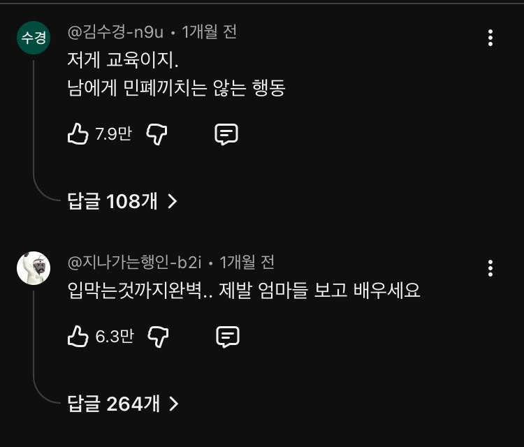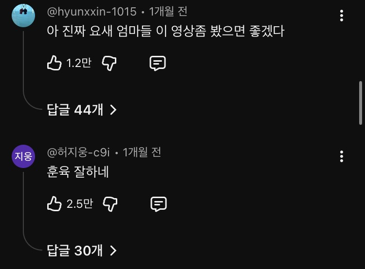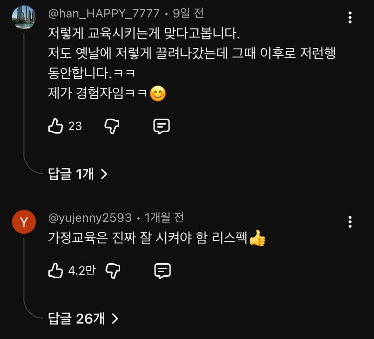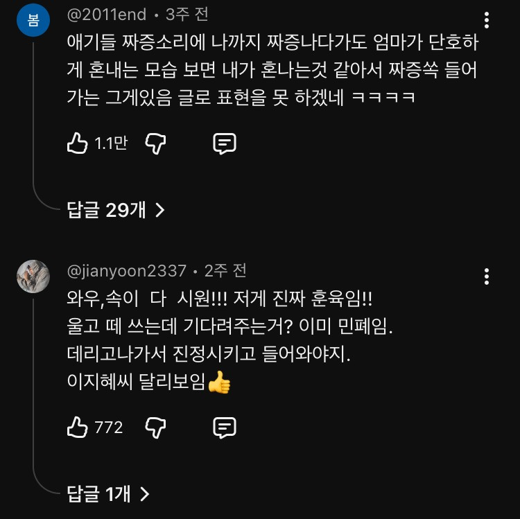 작성자야망뱁새 작성시간 25.11.28 애가 짜증내면 부모는 쩔쩔매고 애한테 휘둘리는 것만 보다가 단호한 엄마 요근래 첨 봐