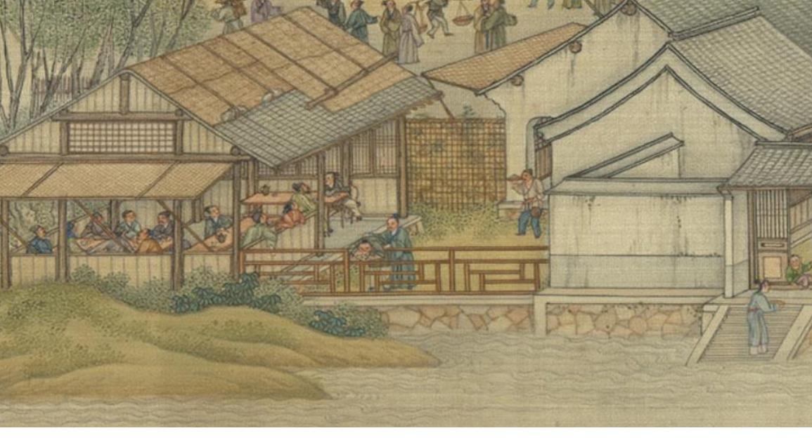 강이 보이는 전경 근처의 식당에 앉아 있는 사람들. 턱을 괴고 기대서 구경하는 사람도 있고, 옆에서 뭘 들고가는 하얀속 옷 입은 사람은 음식 가져다주는 점소이 쯤 되는듯?