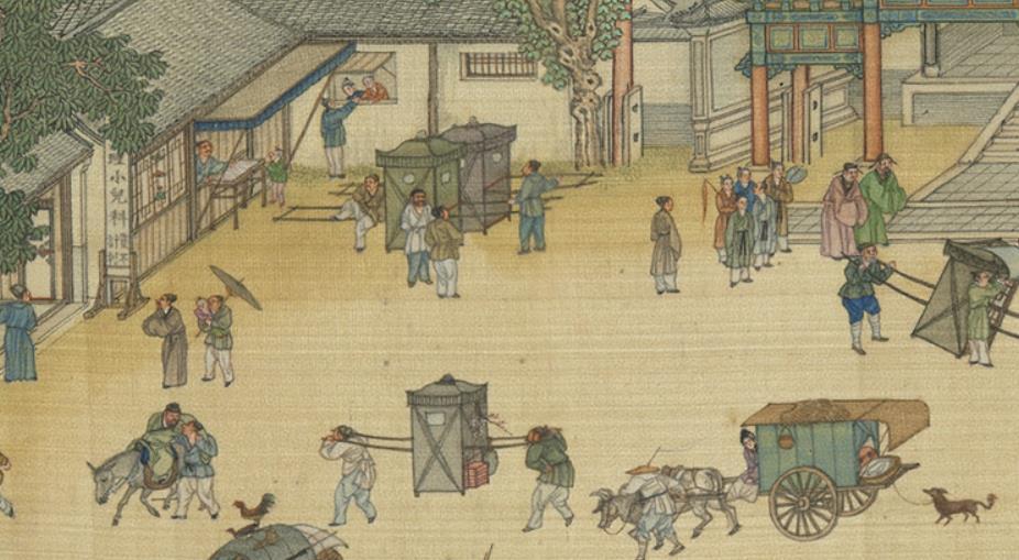 늘어놓은 그림을 감상하는 사람들과 무언가 설법을 하는 도사를 모여서 보는 사람들. 가마 모는 사람들과 낙타에 짐을 채워서 가는 사람들.
