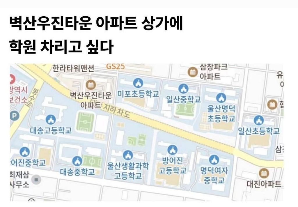 작성자두우우우부 작성시간 25.11.29 벽산우진아파트 상가 절케보면 학교들이랑 가까워보이는데 ㅈㄴ 멀어 대송고랑 그나마 가까운데 대송고 후문에서 진짜 가파른 언덕길 올라가야 나옴 ㅠ 흑흑 저기보단 주로 방어진고등학교-명덕여자중학교 라인에 분식집 그나미 많았는데 요새 지나가면 많이 없어졋더라...
