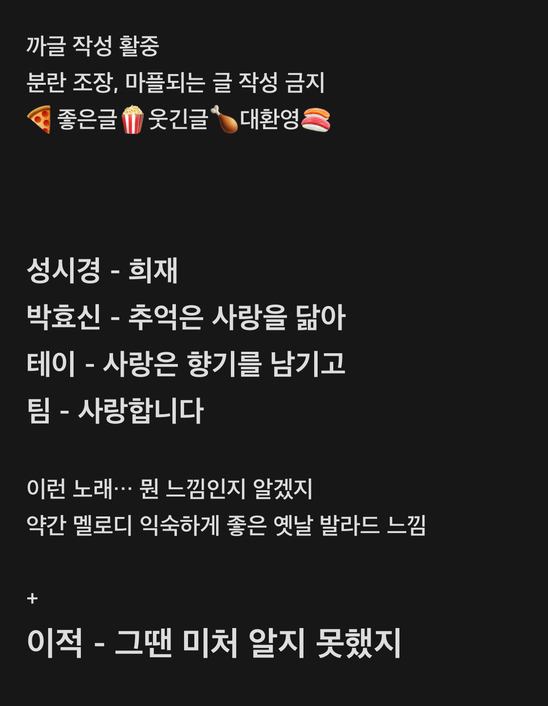 [스크랩] [흥미돋]희재, 추억은 사랑을 닮아, 사랑은 향기를 남기고 <- 이런 노래 말해보는 달글 작성자이수현|작성시간25.11.28|조회수3,771 목록 댓글 84 글자크기 작게가 글자크기 크게가 출처: https://m.cafe.daum.net/subdued20club/WFYL/889917 다음검색 스크랩 원문 : *여성시대* 차분한 20대들의 알흠다운 공간 현재 게시글 추가 기능 열기 북마크 공유하기 신고 센터로 신고 댓글 댓글 84 댓글쓰기 답글쓰기 댓글 리스트 작성자두레쥬르 | 작성시간 25.11.29 이루 까만안경 흰눈 작성자머락오머락오하지마세오 | 작성시간 25.11.29 김길중-사랑했지만윤종신-1월부터 6월까지V.one-그런가봐요애즈원-미안해야하는거니하동균-내가 그댈이기찬-미인/감기/또한번사랑은가고 작성자3135 | 작성시간 25.11.29 아이비 이럴거면 작성자20005 | 작성시간 25.11.29 이수영 휠릴리, grace 작성자힘내고창석 | 작성시간 25.12.03 박효신-화신 댓글 전체보기