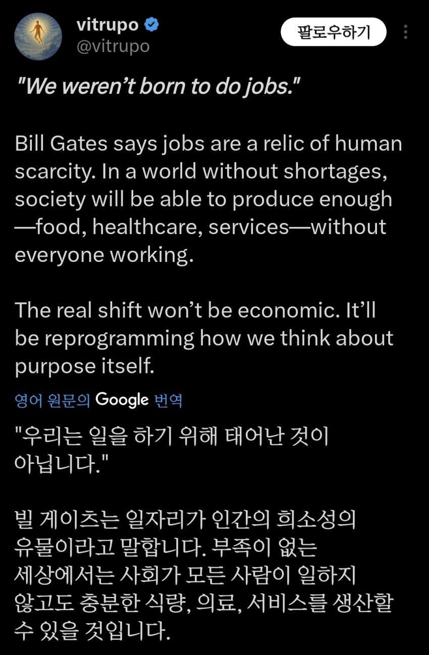 "우리는 일을 하기 위해 태어난 것이 아닙니다. 일자리는 "이런, 누군가는 농부가 되어야 해. 좋아, 누군가는 저 트럭들을 운전해야 해"라는 부족함의 인공물입니다.