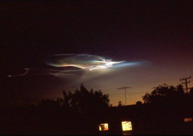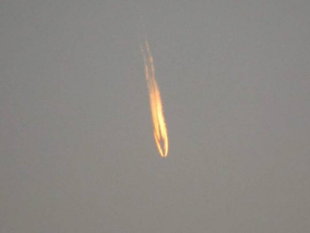 A : 로켓 발사의 잔류물, 황혼 효과라고 불리며 로켓 발사 배기의 흔적입니다.