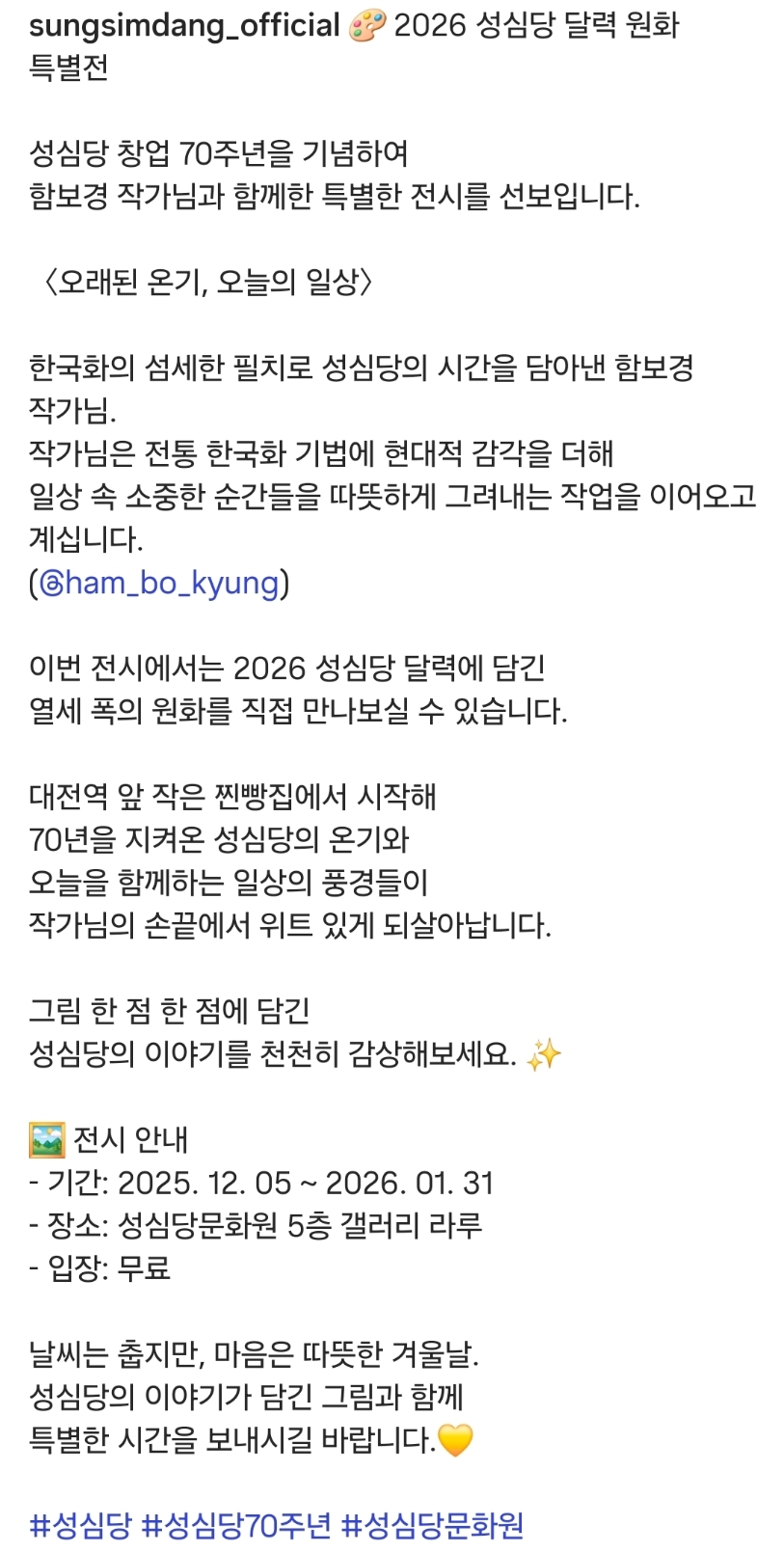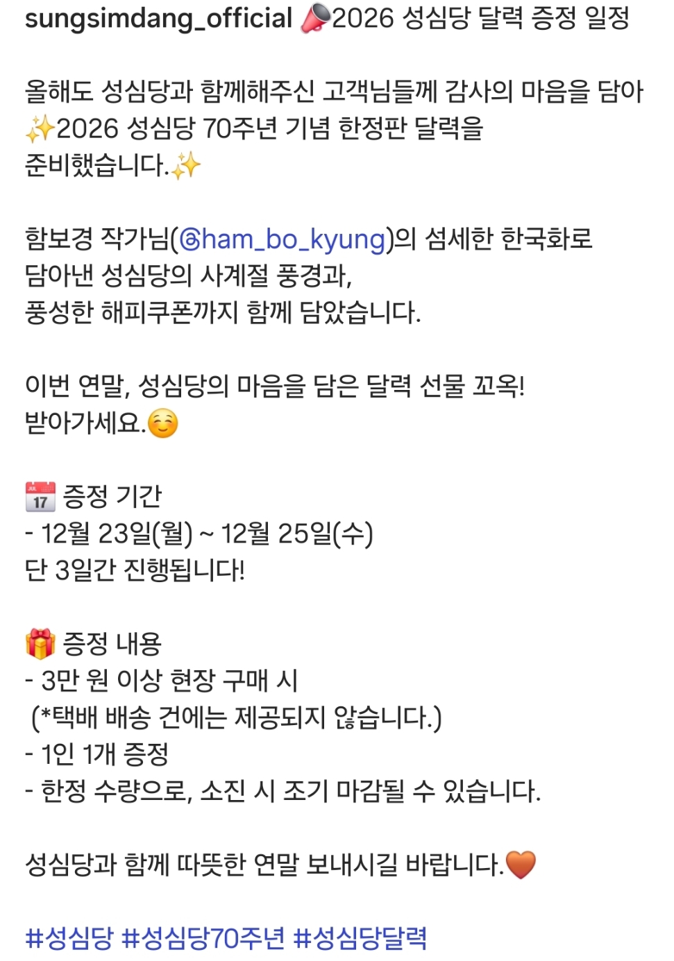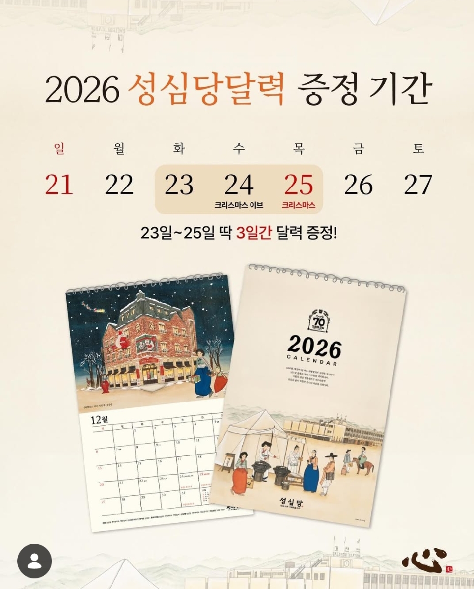 [흥미돋]2026 성심당달력 작성자푸팟퐁커리볶음면|작성시간25.11.29|조회수46,846 목록 댓글 25 글자크기 작게가 글자크기 크게가 출처: 여성시대 푸팟퐁커리볶음면달력증정 기간은 12월 23일-12월 25일12월 5일부터 전시회도 한대요달력 증정기간이랑 날짜가 다르니 확인하고 방문하세요대전여시들 부럽다 다음검색 현재 게시글 추가 기능 열기 북마크 공유하기 신고 센터로 신고 댓글 댓글 25 댓글쓰기 답글쓰기 댓글 리스트 작성자실비김치양념에밥비벼먹기 | 작성시간 25.11.29 와너무 가지고싶다 작성자홈런볼런홈 | 작성시간 25.11.29 달력사면 매달 성심당 제품 한개씩 주는 쿠폰 달려있어! 총 12개 작성자토마토 쿵야 | 작성시간 25.11.29 아 나 22일날 가는데 개아쉽다 아아악 ㅜㅠㅠㅠ 작성자패딩턴온다 | 작성시간 25.11.29 근데 저 시기 사람 진짜 많을 거 같은뎈ㅋㅋㅋㅋ 작성자Amoroso | 작성시간 25.11.29 존나 갖고싶다 개힙해 댓글 전체보기