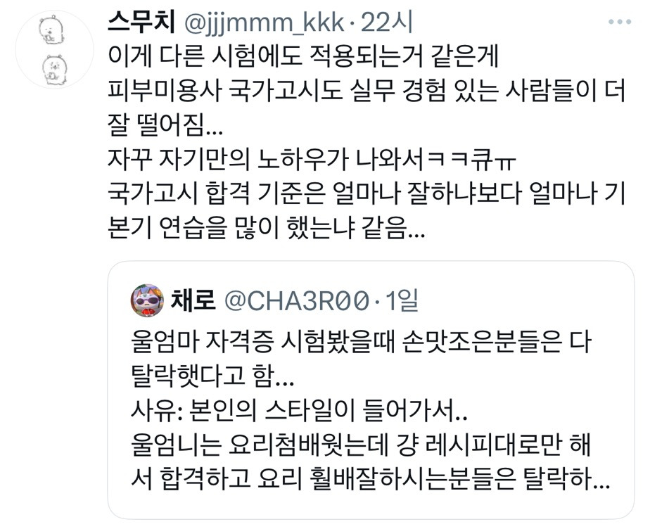 작성자U S A 작성시간 25.11.29 ㅋㅋㅋ피부관리사나 메이크업 자격증도 오히려 현업에서 일하는 전문가들이 탈락하는 경우 많음