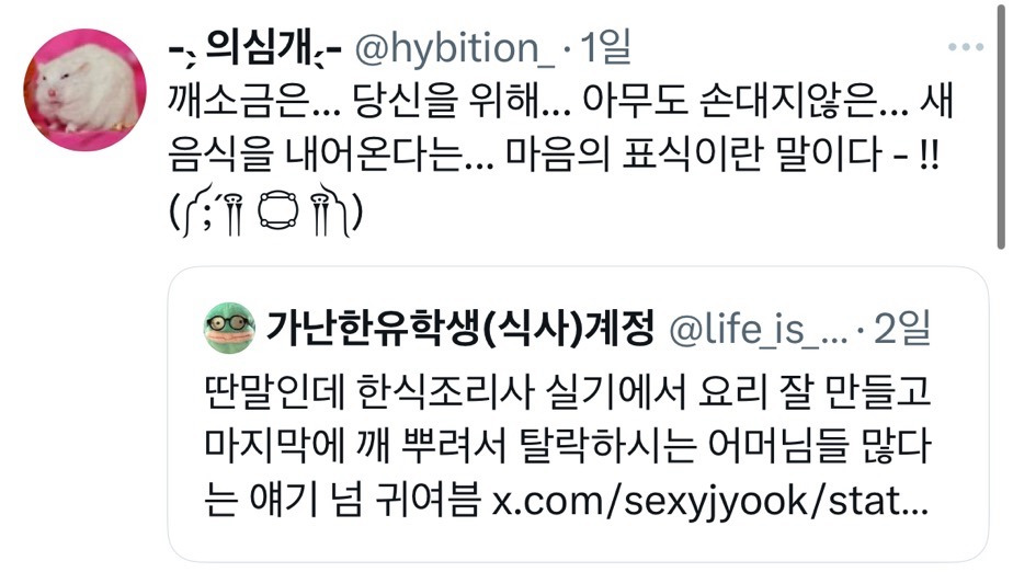 작성자내심장은오직Lee 작성시간 25.11.29 깨를 뿌려야 갓 만든 음식이라는 증거라구요ㅠㅠ
