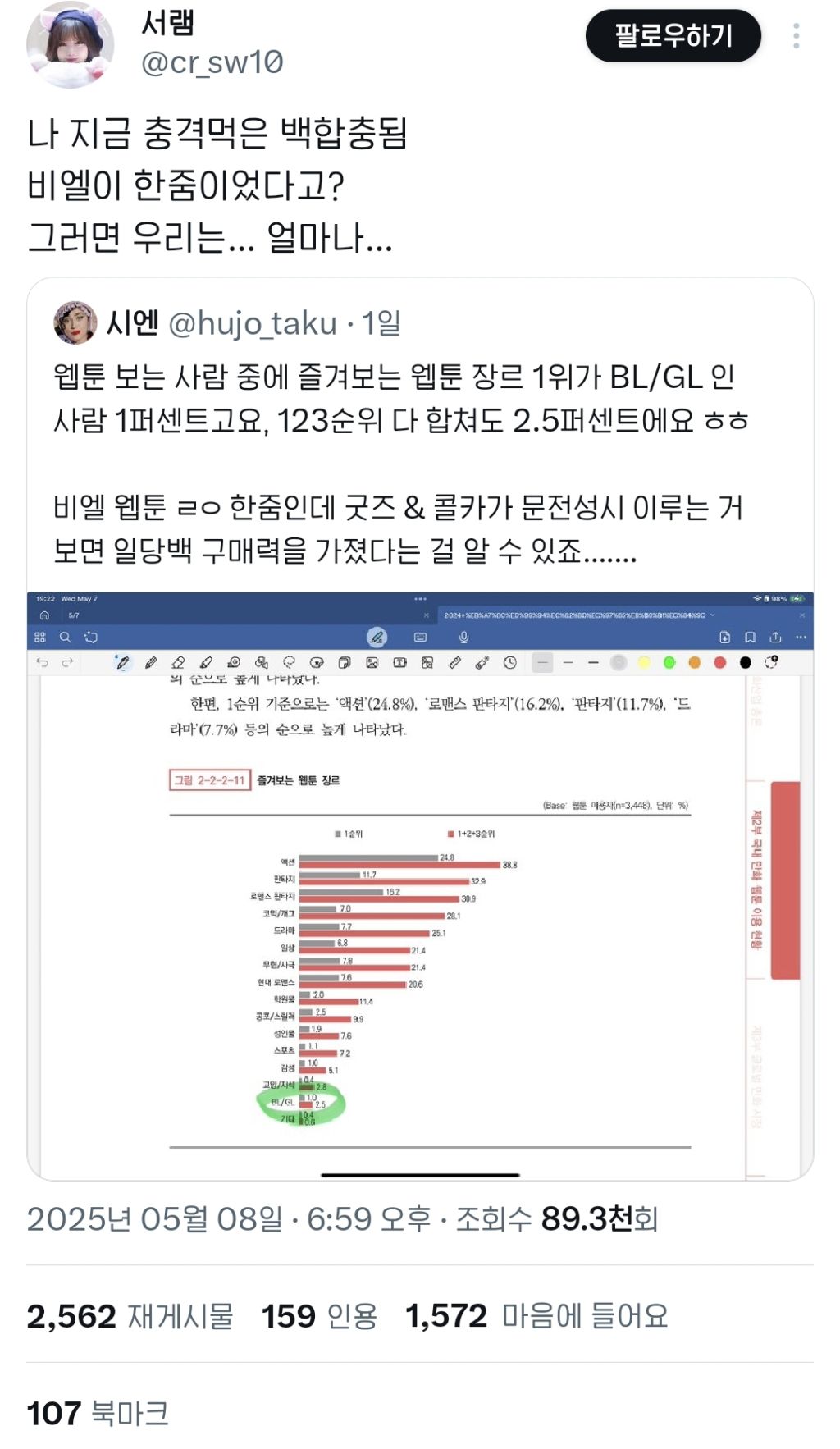 작성자올해안에외노탈출 작성시간 25.11.29 와 로판 왤케 높아….? 개신기… 머글들이 쉽게 접근 가능해서 그런가;; 하긴 주변에 비엘이나 백합 파는 애들은 어렸을때부터 파던 애들이 많던데 나포함… 크고 나서는 절대 진입 안할 장르긴 하지
