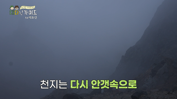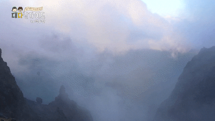 갑자기 바람이 엄청 불면서 안개가 걷히고 천지가 아주 살짝 보이기 시작함