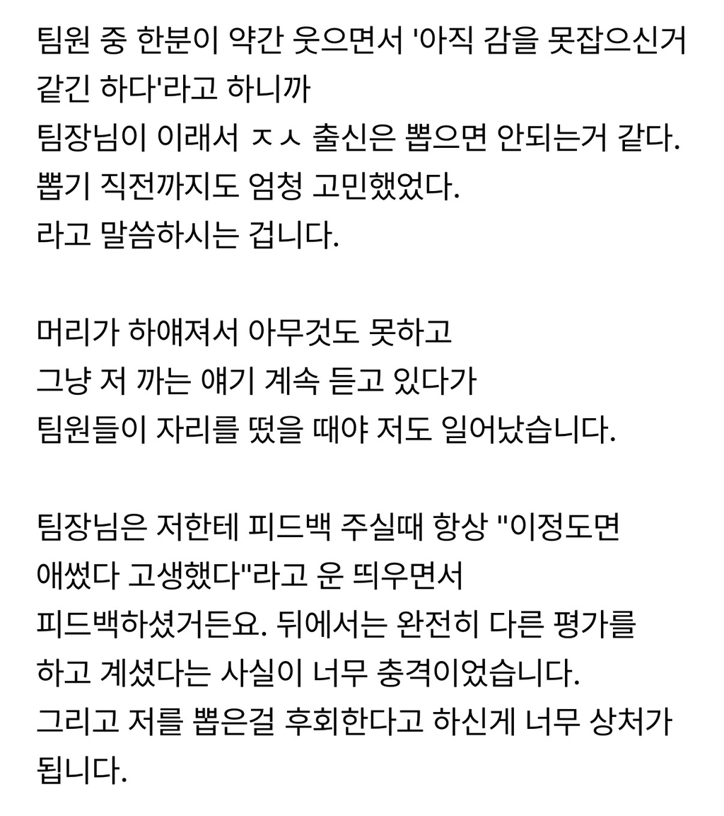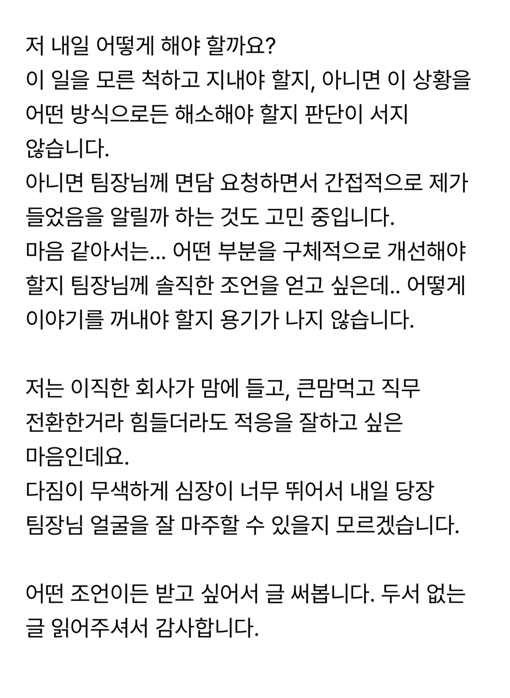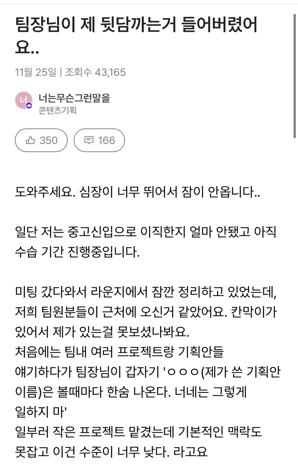 작성자예네예뭐라구요 작성시간 25.12.01 걍 앞에서 아쉬운거 면담잡아서 말하지 저게뭐노 뒷담깔때 있었던 다른 팀원은 이제 무시하겠지? 팀분위기 개박살나겠네 그냥 이거는 무조건 팀장 여력 부족임 부족한 부분 면담해서 끌어올리고 그 직원 강점 찾는것도 본인 역할임 우대사항아니고 기본역할
