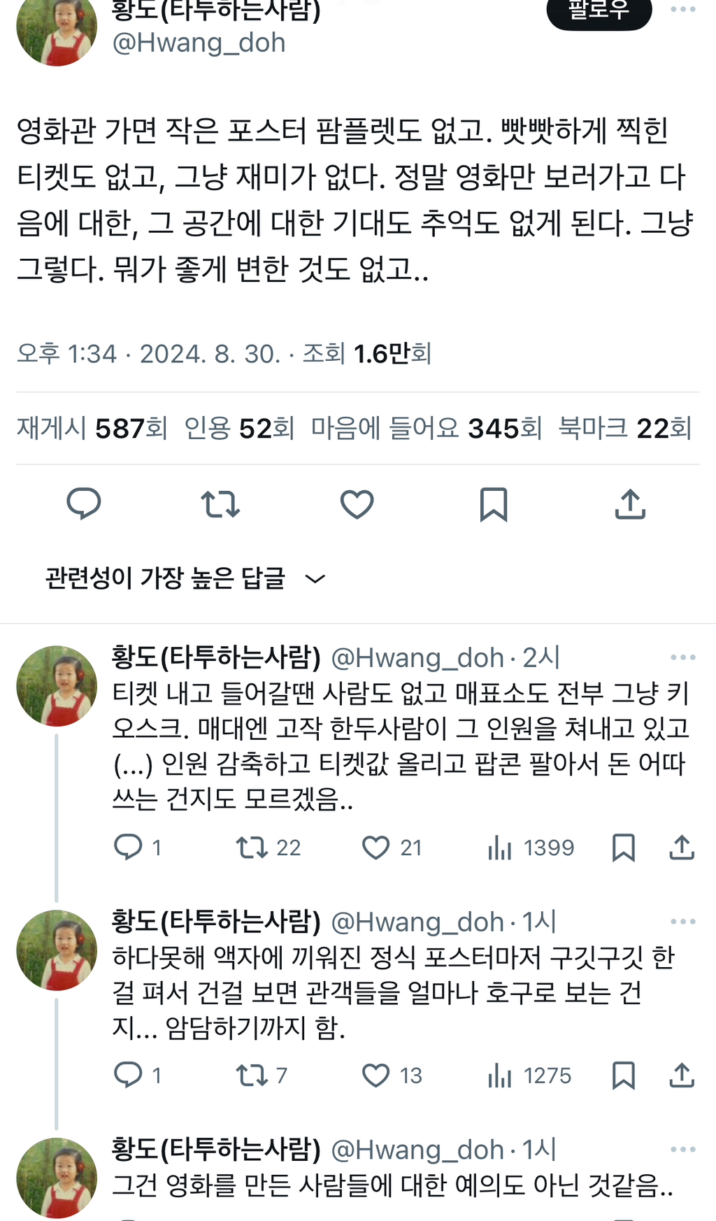 작성자나라가허락한뮤직이즈마이라이프 작성시간 25.11.30 영화관은 경험을 팔아야하는건데 이제 그게 없음
