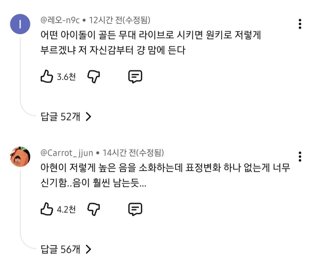 작성자쀼융쀼융 작성시간 25.11.30 아니 잘하기만하는데 조회수폭발한거보면모르나.. 저렇게 원키로 라이브하는애들 쉬운줄아나 립싱크하고 못하는 남돌도 개많은데 ㅋㅋㅋㅋㅋㅋㅋㅋㅋ