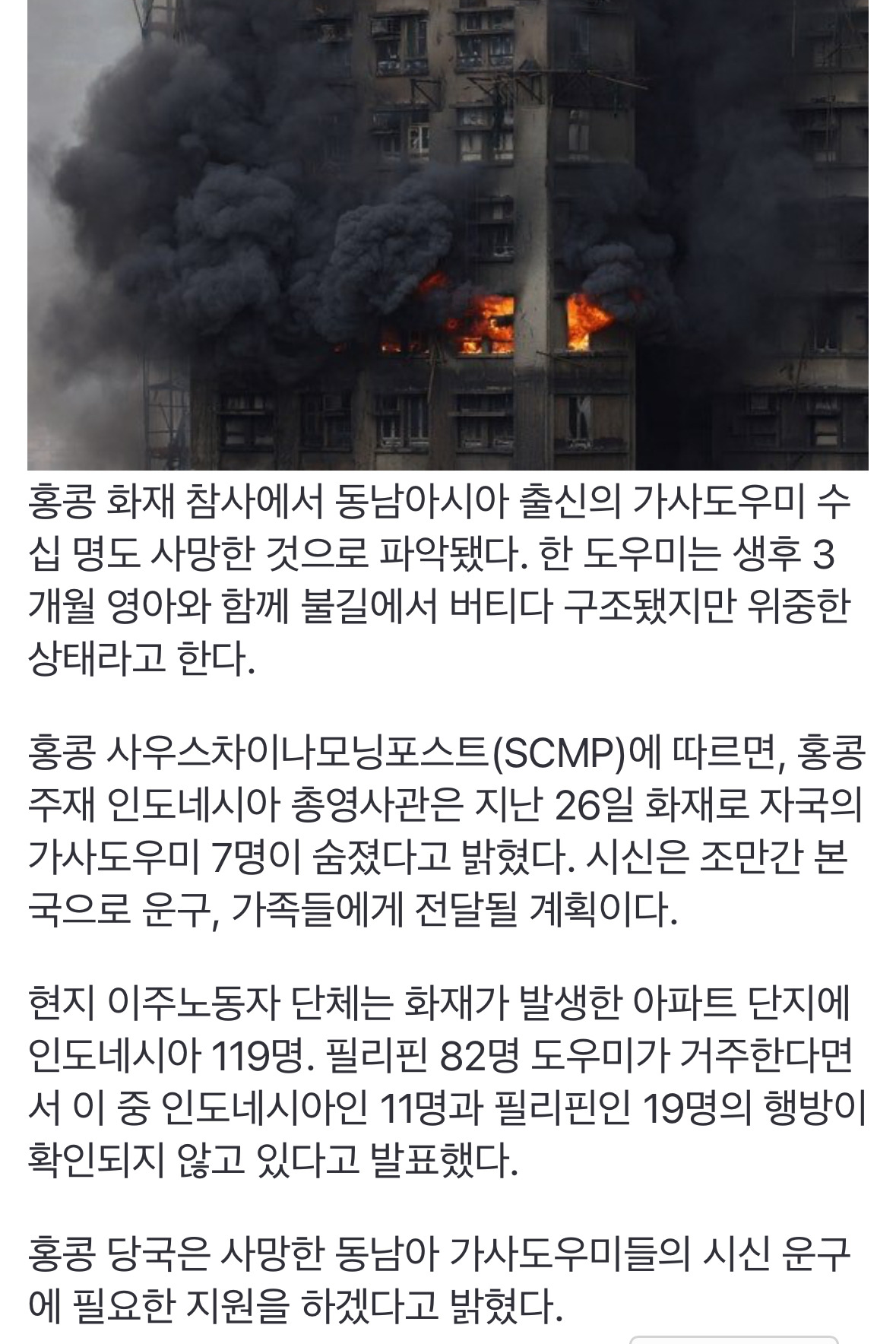 [여시뉴스데스크]"끝까지 아기 안고"…홍콩 화마에 동남아 가사도우미 수십명 사망 작성자폼봄부린|작성시간25.11.30|조회수24,477 목록 댓글 12 글자크기 작게가 글자크기 크게가 출처: https://n.news.naver.com/article/025/0003486407?sid=104"끝까지 아기 안고"…홍콩 화마에 동남아 가사도우미 수십명 사망홍콩 화재 참사에서 동남아시아 출신의 가사도우미 수십 명도 사망한 것으로 파악됐다. 한 도우미는 생후 3개월 영아와 함께 불길에서 버티다 구조됐지만 위중한 상태라고 한다. 사우스차이나n.news.naver.com 다음검색 현재 게시글 추가 기능 열기 북마크 공유하기 신고 센터로 신고 댓글 댓글 12 댓글쓰기 답글쓰기 댓글 리스트 작성자초코과자감별사 | 작성시간 25.11.30 ㅜㅜ 작성자여름너무더워!!! | 작성시간 25.11.30 그러겠다 진짜 홍콩에 동남아 가사도우미 엄청 많잖아... 작성자대 아니고 데 | 작성시간 25.11.30 아진짜 세상이 왜이렇게 잔인하냐 돈벌러간게 무슨죄라고.. 작성자산미치광이 | 작성시간 25.11.30 어떡해......... 작성자쇼밥쇼 | 작성시간 25.11.30 아기안고 ㅠㅠ.. 지켜준 아기는 어떻게됐으려나.. 아기라도 살길 바랐을텐데ㅠㅠㅠㅠㅠ 너무 안타깝다 댓글 전체보기