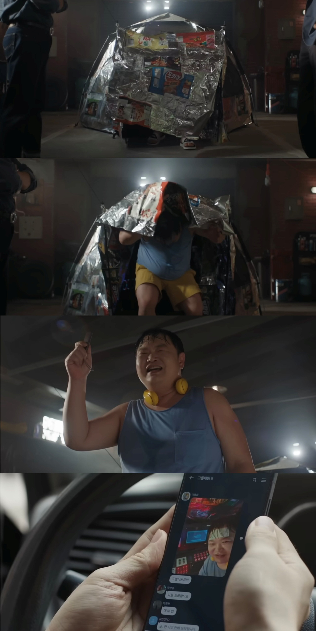 그리고 과자봉지로 둘러싼 텐트 안에서