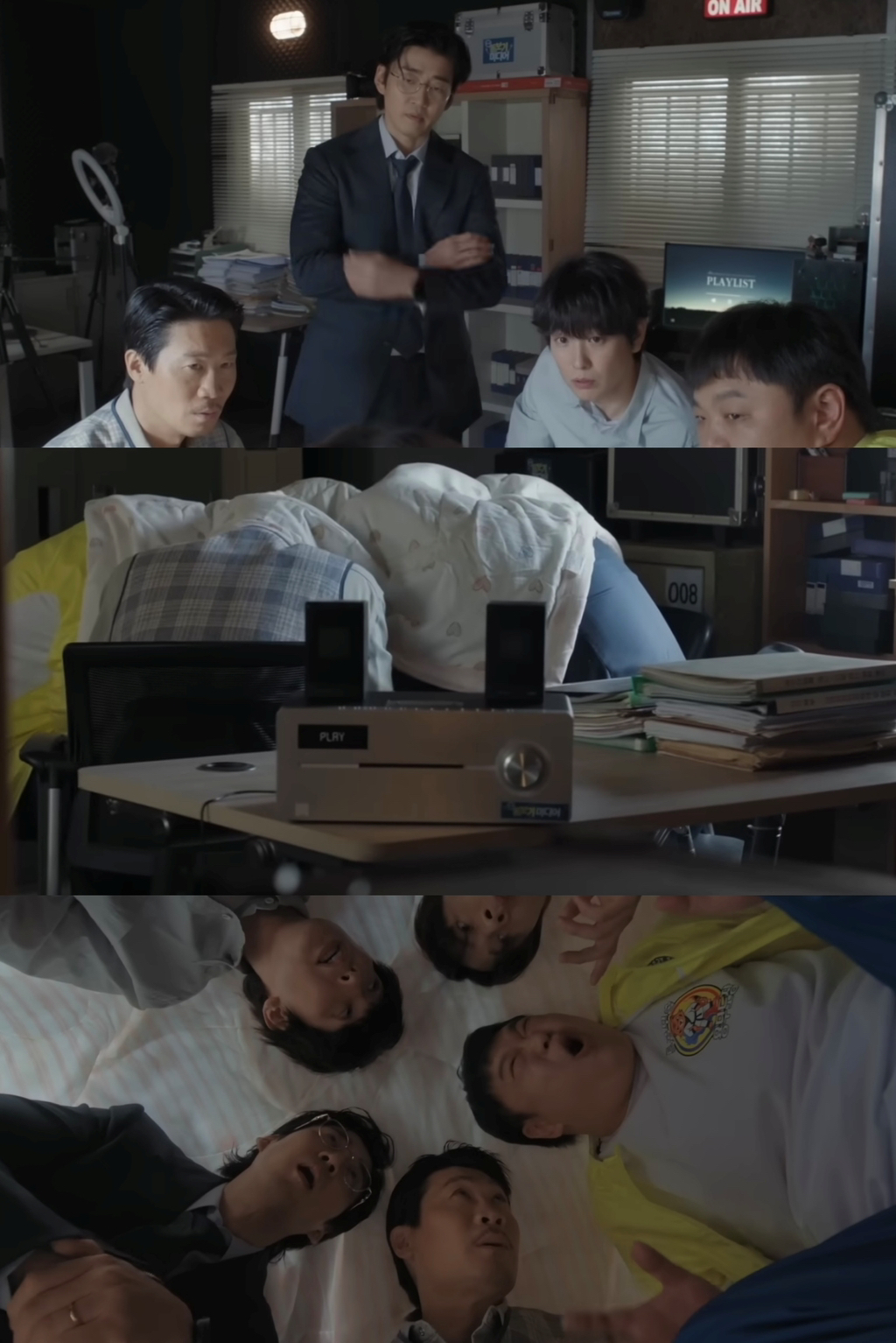음악은 계속 틀어놓은 상태에서 이불 속에 모여 작전을 짜는 멤버들ㅋㅋ
