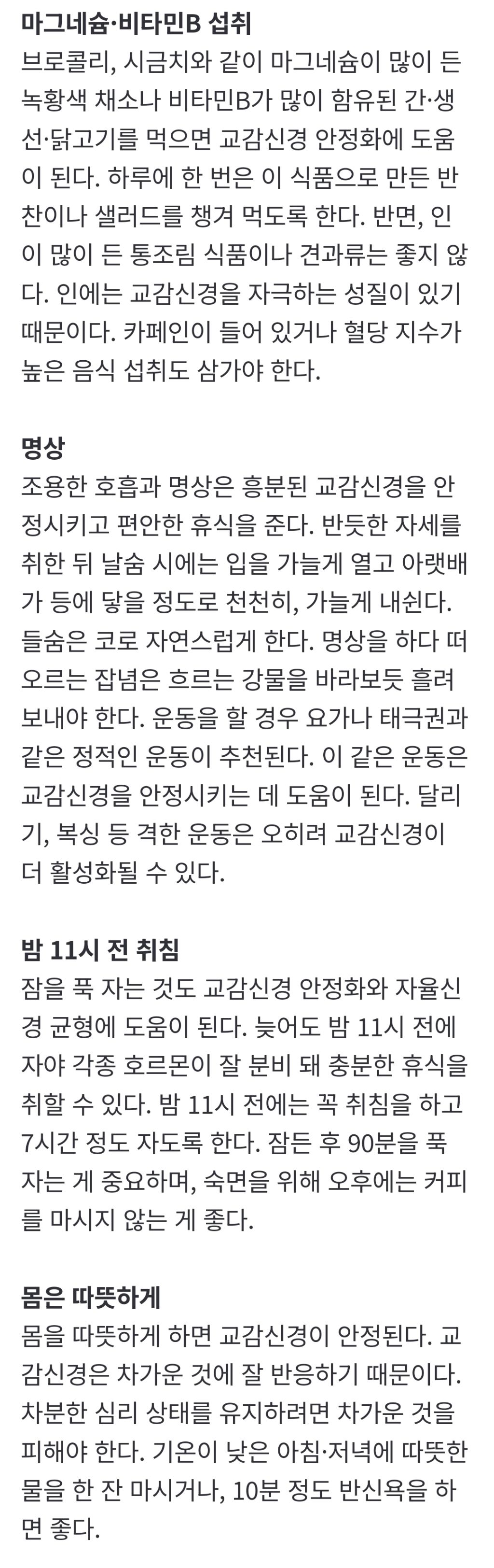 [흥미돋]부쩍 예민해졌다면… ‘교감신경’ 관리해보세요 작성자킨덜|작성시간25.12.01|조회수12,446 목록 댓글 9 글자크기 작게가 글자크기 크게가 출처: https://naver.me/FYuWU7Yr부쩍 예민해졌다면… ‘교감신경’ 관리해보세요최근 이유 없이 신경이 예민해진 것 같다면 ‘교감신경 과로’가 원인일 수 있다. 몸의 자율신경은 교감신경과 부교감신경이 서로 반대 작용을 하며 균형을 맞추지만, 스트레스나 피로 등으로 n.news.naver.com 다음검색 현재 게시글 추가 기능 열기 북마크 공유하기 신고 센터로 신고 댓글 댓글 9 댓글쓰기 답글쓰기 댓글 리스트 작성자3학년 1반 김민지 | 작성시간 25.12.01 저거 다해도 겁나 예민 작성자딥치즈 베이컨 포테이토 | 작성시간 25.12.01 진짜 뭐 검사 좀 받아야될거 같아 작성자정치보복렛츠고 | 작성시간 25.12.01 열한시전 취침 어떻게 하는 건데ㅜ 작성자아이보리얼그레이 | 작성시간 25.12.01 부교감신경만 대단히 일하는중이면 어카나요..? 화가안나고 사람들이 늘 선넘고 ㅠ 잠 개많이자고 성취욕이 없으면요... 작성자xnxbwkq | 작성시간 25.12.01 나다 댓글 전체보기