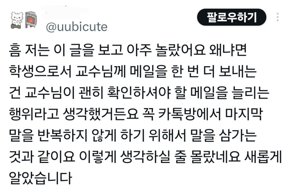 작성자애플마니아 작성시간 25.12.13 걍 적당히 알아서…하는거지..꼭 해야돼 이건 모르겠어 ㅎ 신경써서 답변해주셨다하면 감사인사 보낼거같고 그정도는 아닌 단순 주고받고 정도면 굳이….?? 직장인 비교하면 안된다는말도 있는데 교수님도 직장인이세요..