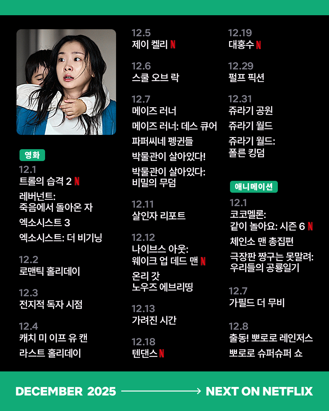 [흥미돋]올해의 엔딩 크레딧, 넷플릭스 12월 신작 라인업 작성자김 재영|작성시간25.12.01|조회수26,183 목록 댓글 41 글자크기 작게가 글자크기 크게가 출처: https://www.instagram.com/p/DRtKDEHk8tB 다음검색 현재 게시글 추가 기능 열기 북마크 공유하기 신고 센터로 신고 댓글 댓글 41 댓글쓰기 답글쓰기 댓글 리스트 작성자행운의아기수달 | 작성시간 25.12.01 나이브스아웃 미친 사랑해요 작성자돼지대충돌 | 작성시간 25.12.01 자백의 대가가 명인 장인 하는 그 대가가 아니라 치뤄야 할 대가였구나 작성자꾸짖을갉 | 작성시간 25.12.01 다니엘 크레이그 왤케늙었어 영감님됐네 작성자아이고무섭다무서버 | 작성시간 25.12.01 히히 에밀리 좋아... 나으도파민... 작성자밤소풍 | 작성시간 25.12.02 야호 ㅋ 댓글 전체보기