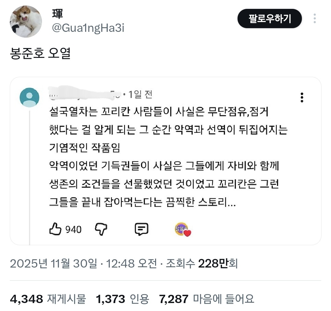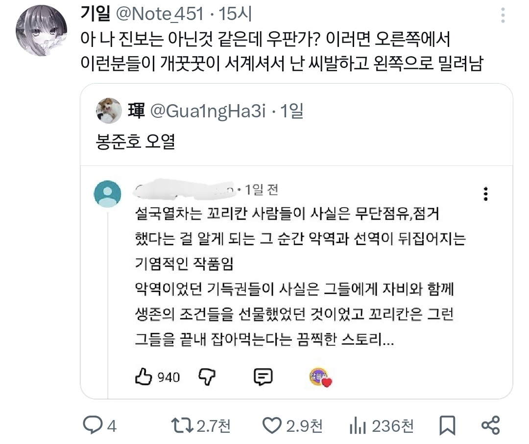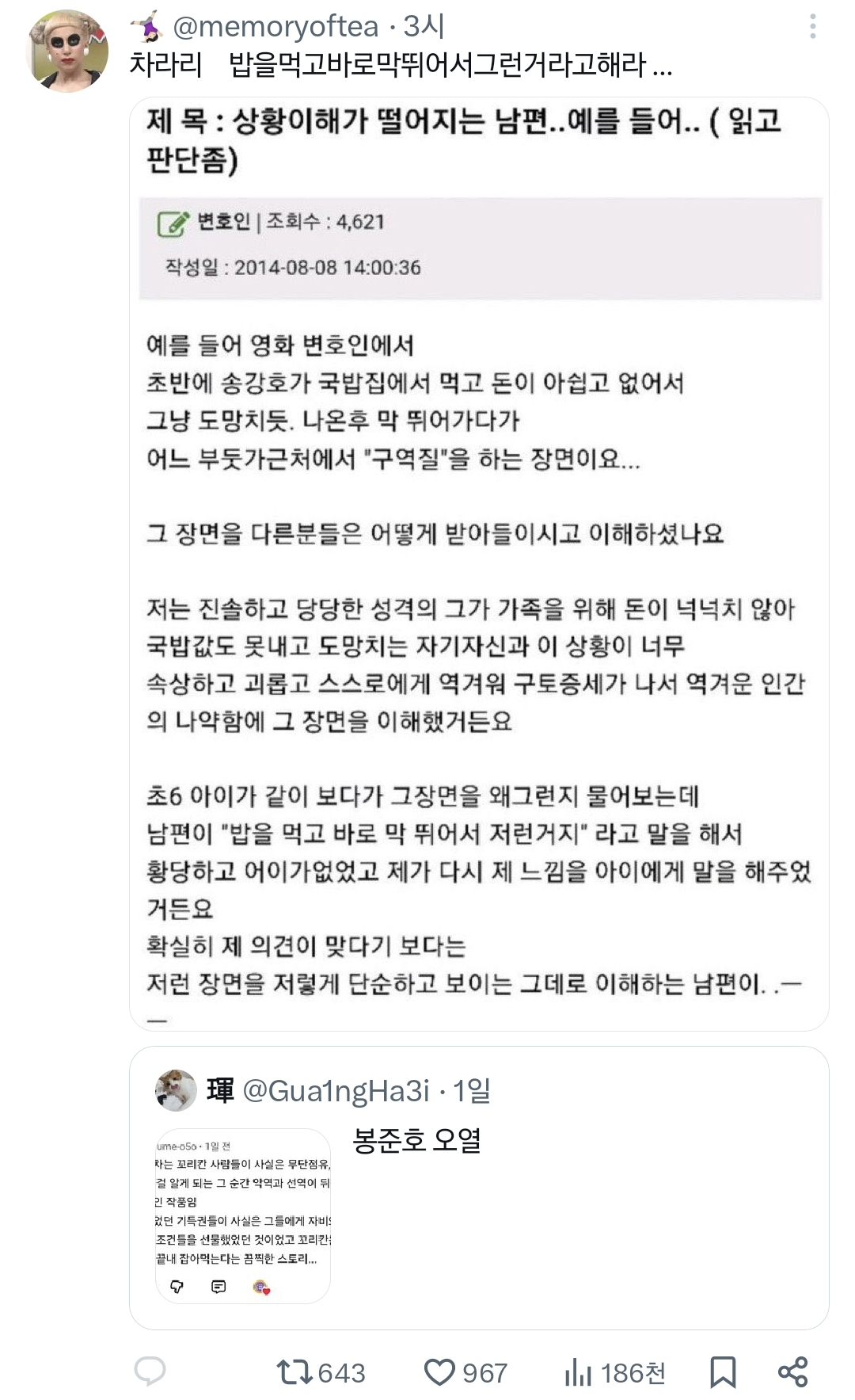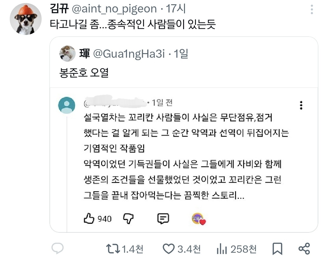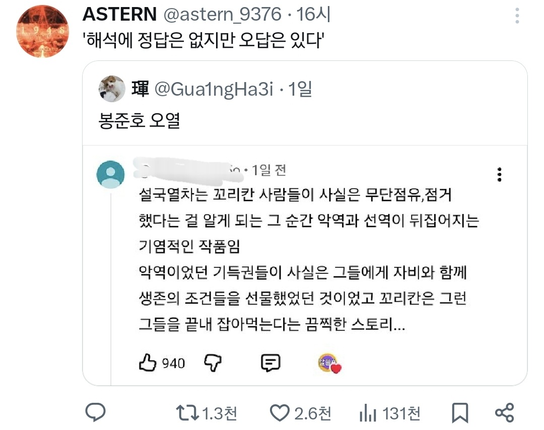 [흥미돋]봉준호가 보면 오열할 것 같다는 영화 <설국열차> 감상 해석평.twt 작성자스피또띠아|작성시간25.12.01|조회수44,536 목록 댓글 44 글자크기 작게가 글자크기 크게가 출처: https://x.com/Gua1ngHa3i/status/1994795502383370442?s=19 여성시대 스피또띠아작품 보고 해석은 자유라지만 저건 뭐... 맥락맹수준 다음검색 현재 게시글 추가 기능 열기 북마크 공유하기 신고 센터로 신고 댓글 댓글 44 댓글쓰기 답글쓰기 댓글 리스트 작성자깐따삐아 | 작성시간 25.12.01 ㅋㅋㅋㅋ어머 세상에 작성자VTIC 신청려 | 작성시간 25.12.01 같은 .... 영화를 본게 맞나요 작성자나보면여시그만하라고말해주라 | 작성시간 25.12.01 나진심 순간 뇌정지옴 작성자lateCheckout | 작성시간 25.12.01 진짜 순간 ????함 미친.. 어케 저런생각을 하지 대단하다 작성자Green hexagon | 작성시간 25.12.02 봉준호 같은 사람과 저딴 사람이 한 나라에 산다는… 아이러니함… 댓글 전체보기