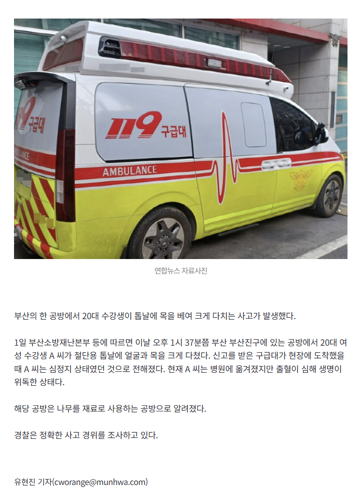 [여시뉴스데스크][속보]‘어쩌다가…’ 부산 공방서 20대 女수강생, 톱날에 목 베여 심정지 작성자딜런댈런|작성시간25.12.01|조회수32,611 목록 댓글 91 글자크기 작게가 글자크기 크게가 출처: https://n.news.naver.com/article/021/0002753995[속보]‘어쩌다가…’ 부산 공방서 20대 女수강생, 톱날에 목 베여 심정지연합뉴스 자료사진 부산의 한 공방에서 20대 수강생이 톱날에 목을 베여 크게 다치는 사고가 발생했다. 1일 부산소방재난본부 등에 따르면 이날 오후 1시 37분쯤 부산 부산진구에 있는 공방에서 2n.news.naver.com 다음검색 현재 게시글 추가 기능 열기 북마크 공유하기 신고 센터로 신고 댓글 댓글 91 댓글쓰기 답글쓰기 댓글 리스트 작성자아라비아따 따따따 | 작성시간 25.12.01 삼가 고인의 명복을 빕니다 작성자blackmonkey | 작성시간 25.12.01 삼가 고인의 명복을 빕니다 작성자올해 로또 1등 당첨자 | 작성시간 25.12.02 삼가 고인의 명복을 빕니다 작성자이게댄다고 | 작성시간 25.12.02 아 ㅠㅠㅠ 힘줘서 밀다가 킥백에 넘어졌나 아니 아 저렇게 위험한걸 옆에서 봐주는 사람 없었냐고 ㅠㅜ 안타까워서 어떡하냐 작성자반대 | 작성시간 25.12.02 삼가 고인의 명복을 빕니다 댓글 전체보기