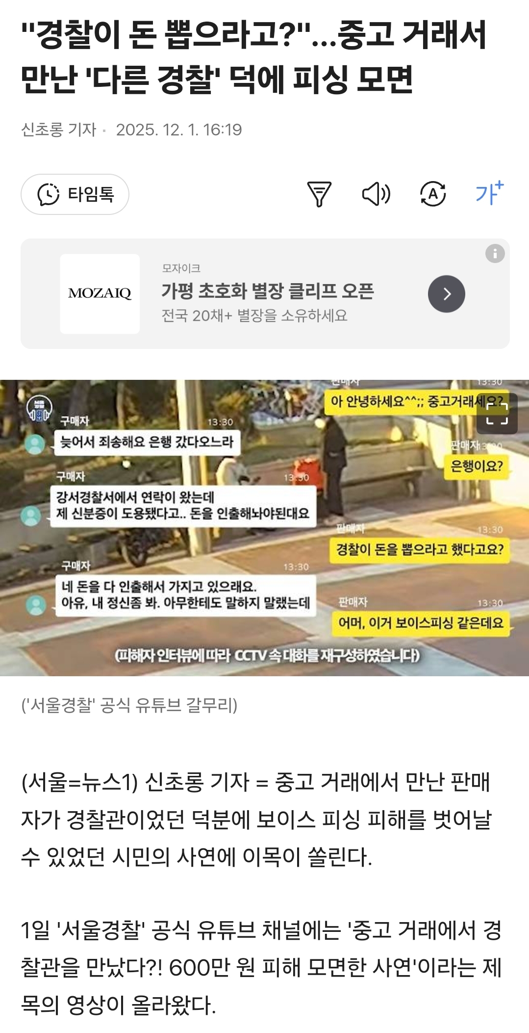 [여시뉴스데스크]"경찰이 돈 뽑으라고?"…중고 거래서 만난 '다른 경찰' 덕에 피싱 모면 작성자고운손고운발|작성시간25.12.01|조회수6,756 목록 댓글 4 글자크기 작게가 글자크기 크게가 출처: https://v.daum.net/v/20251201161919465 ... 전문은 출처로.. 다음검색 현재 게시글 추가 기능 열기 북마크 공유하기 신고 센터로 신고 댓글 댓글 4 댓글쓰기 답글쓰기 댓글 리스트 작성자김도넛 | 작성시간 25.12.01 와 운이 좋으셧네 심지어 강서경찰서 소속 ㅋㅋㅋㅋ 작성자미치괭이 | 작성시간 25.12.01 어떻게 딱 강서경찰서소속이야 다행이다진짜 작성자마루는가나디 | 작성시간 25.12.01 와 다행이다 신분증 같은게 딱 나와서 믿으셨을까? 저거 막 쫓아다니면서 말려도 안믿는 사람도 많던데 다행 작성자뾰로롱어른마녀 | 작성시간 25.12.01 진짜진짜 다행이다 ㅠ 어쩜 소속도같고 피해자분이 첨에 늦은사유 당황해서 설명한게 운명이네 댓글 전체보기