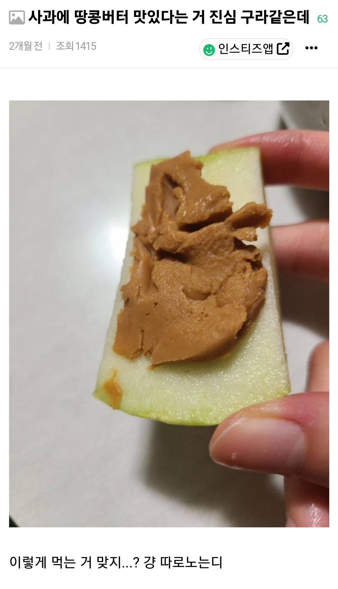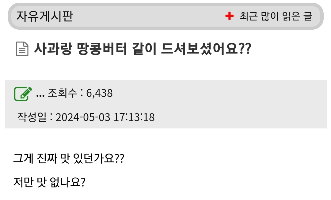 작성자배고배고파 작성시간 25.12.03 나도 첨엔 맛없었는데 아사이베리볼? 그거에 땅콩버터있는거 먹어봤다가 와 존맛이다 하고 사과에땅콩버터 발랐더니 그것도 맛있어졌음