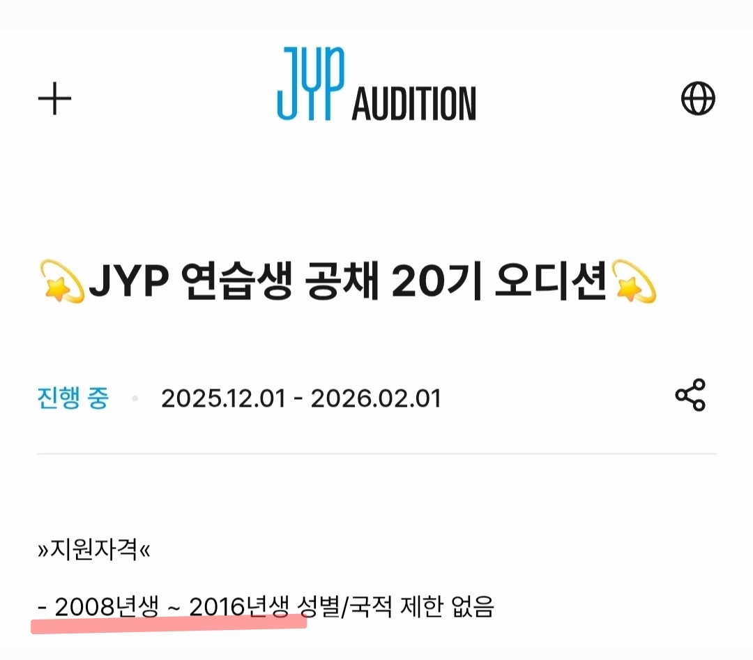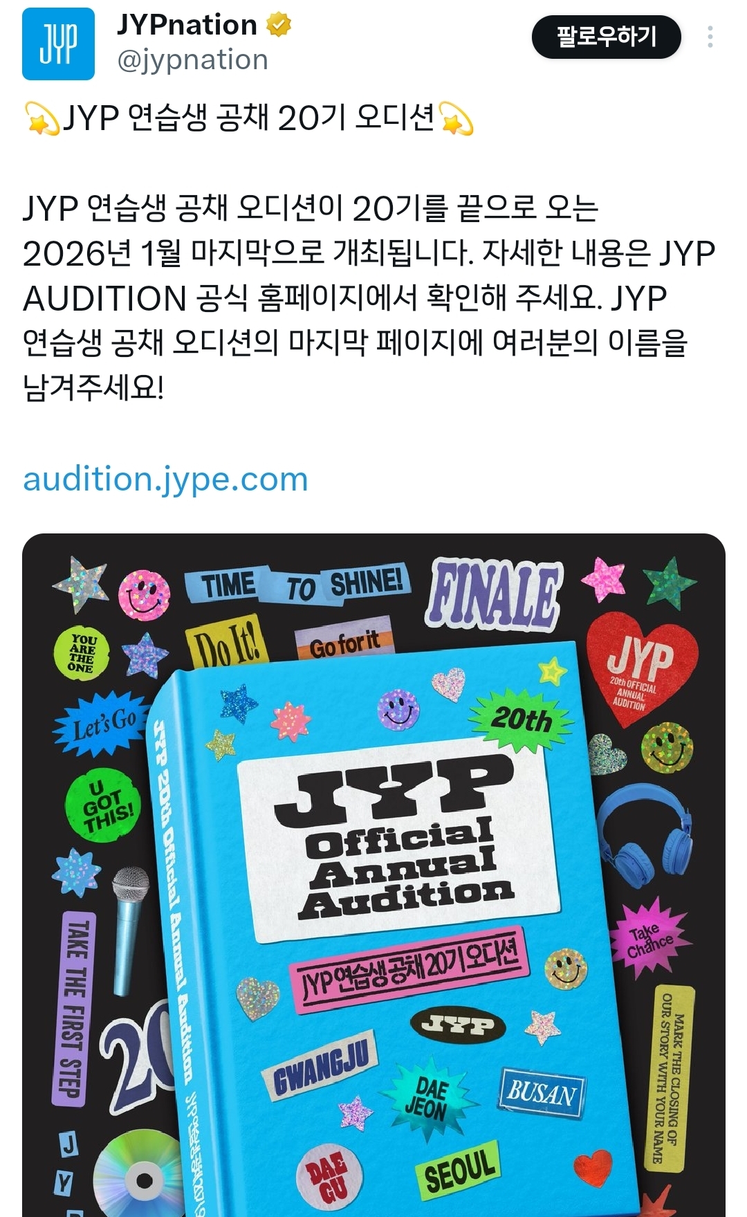 [흥미돋]JYP 공채 오디션 본다는데 도전해보실 분 작성자단호하게|작성시간25.12.02|조회수30,324 목록 댓글 45 글자크기 작게가 글자크기 크게가 출처: 여성시대 단호하게마지막 오디션이라는데 그럼 이제 더이상 안뽑는건가?우린 나이로 탈락입니다사실 지원자격 나이보고 놀라서 가져옴2016년생이 이유식 먹는 나이가 아니라 공채 오디션 볼 수 있는 나이구나... 다음검색 현재 게시글 추가 기능 열기 북마크 공유하기 신고 센터로 신고 댓글 댓글 45 댓글쓰기 답글쓰기 댓글 리스트 작성자봉봉미미 | 작성시간 25.12.02 초등학교 3학생(현 2016년생)부터 본다고?????? 작성자쫑쫑돌쫑 | 작성시간 25.12.02 08학번~16학번으로 해줘요 작성자dive into you | 작성시간 25.12.02 ㅠ. 작성자수정과 | 작성시간 25.12.02 마이 늦네 내가 작성자털복숭이 | 작성시간 25.12.02 갓난아기가 어떻게 오디션을봐요😡😡 댓글 전체보기