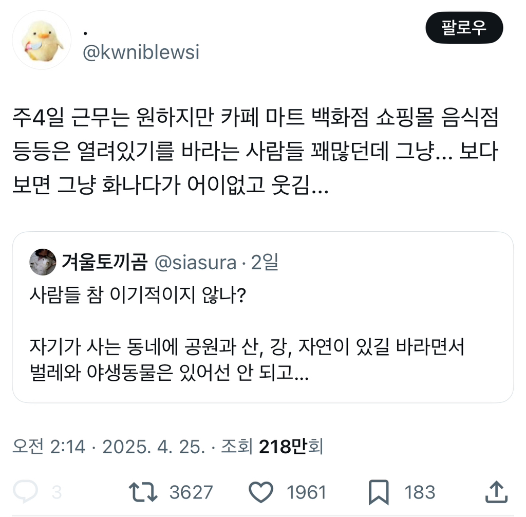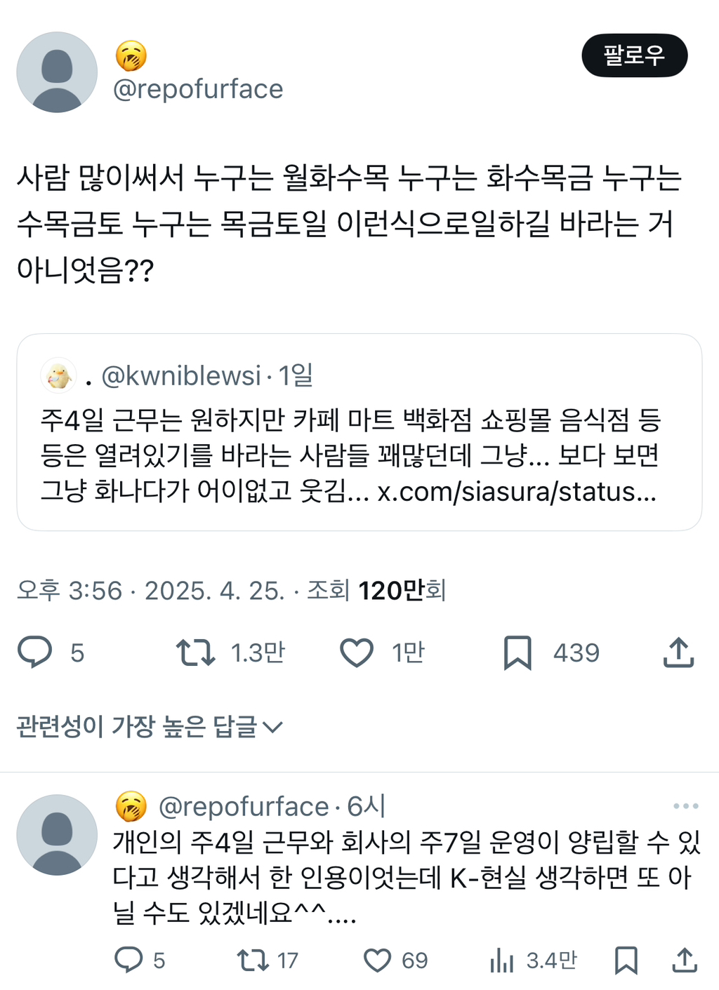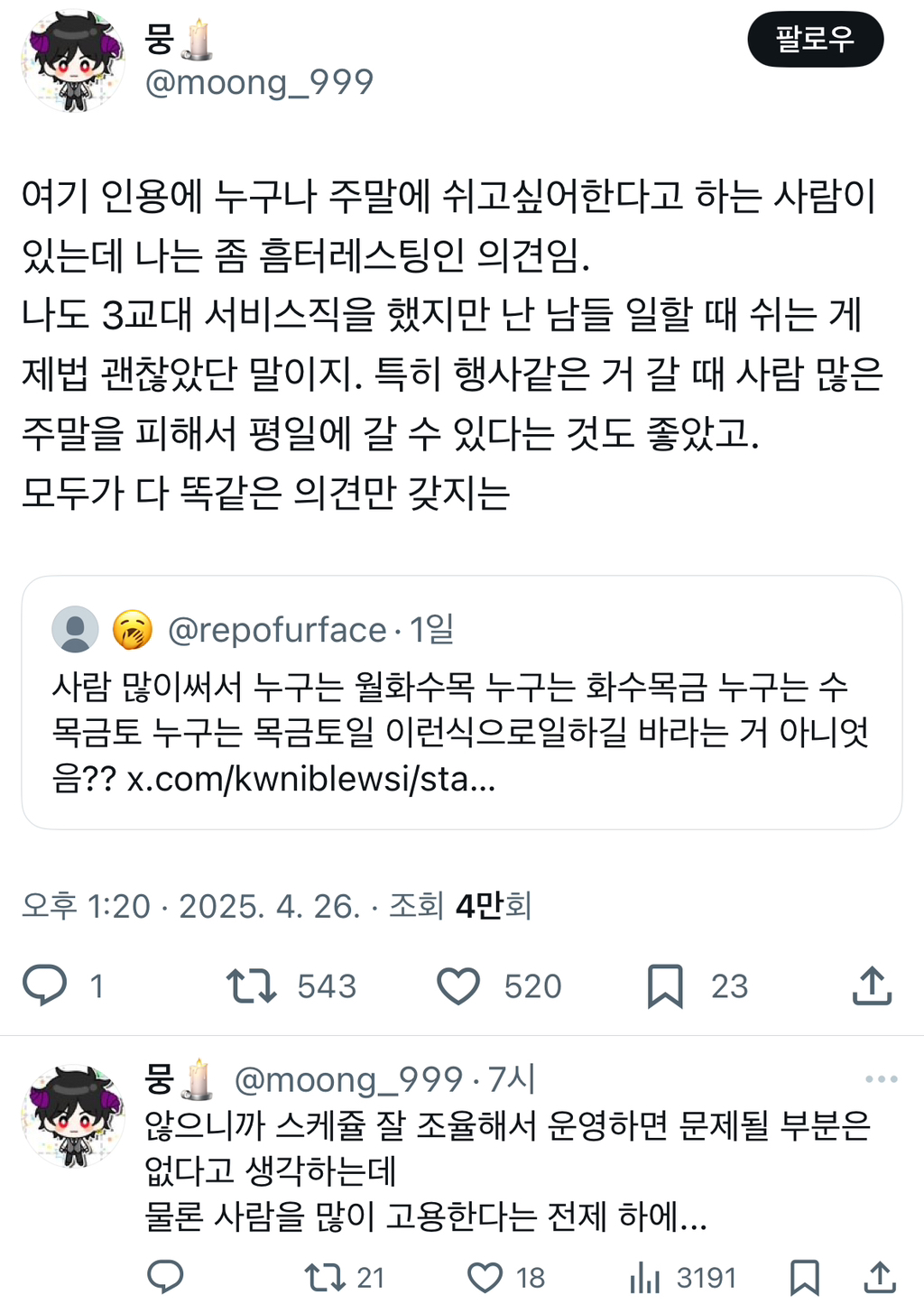 [스크랩] [흥미돋]주4일 근무는 원하지만 카페 마트 백화점 쇼핑몰 음식점 등등은 열려있기를 바라는 사람들 꽤많던데.twt