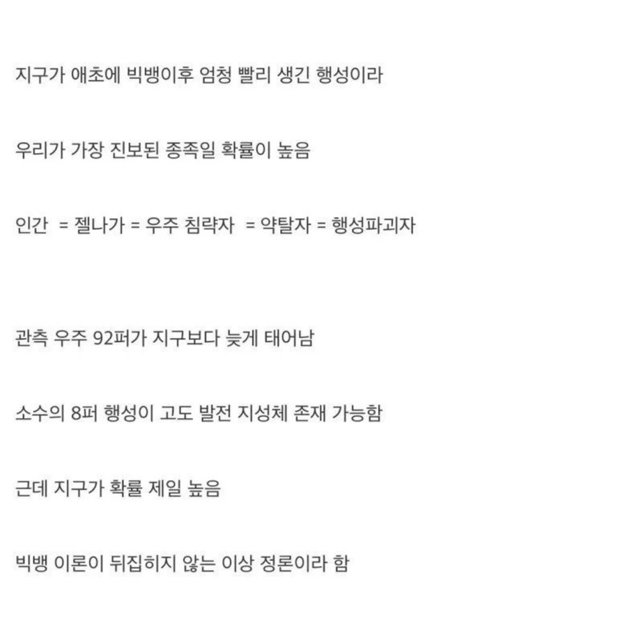 [흥미돋]NASA 피셜 우주에서 제일 진보된 별은 지구 작성자이것머애요|작성시간25.12.02|조회수12,699 목록 댓글 46 글자크기 작게가 글자크기 크게가 출처: 여성시대 이것머애요 다음검색 현재 게시글 추가 기능 열기 북마크 공유하기 신고 센터로 신고 댓글 댓글 46 댓글쓰기 답글쓰기 댓글 리스트 작성자안뇽허생스 | 작성시간 25.12.02 심해인은 있겠지?ㅎ 작성자식이섬유소보루 | 작성시간 25.12.02 우리 고대인이네 작성자부찌머그러오세요 | 작성시간 25.12.02 관측 우주의 기준이 우리 기준 아냐? 작성자아무닉네임임 | 작성시간 25.12.03 ‘관측 우주’ 의 92퍼면전체우주에서봤을땐 너무작은거아냐? 작성자곰브리치야 내 이름 적어둬라 | 작성시간 25.12.03 오… 댓글 전체보기