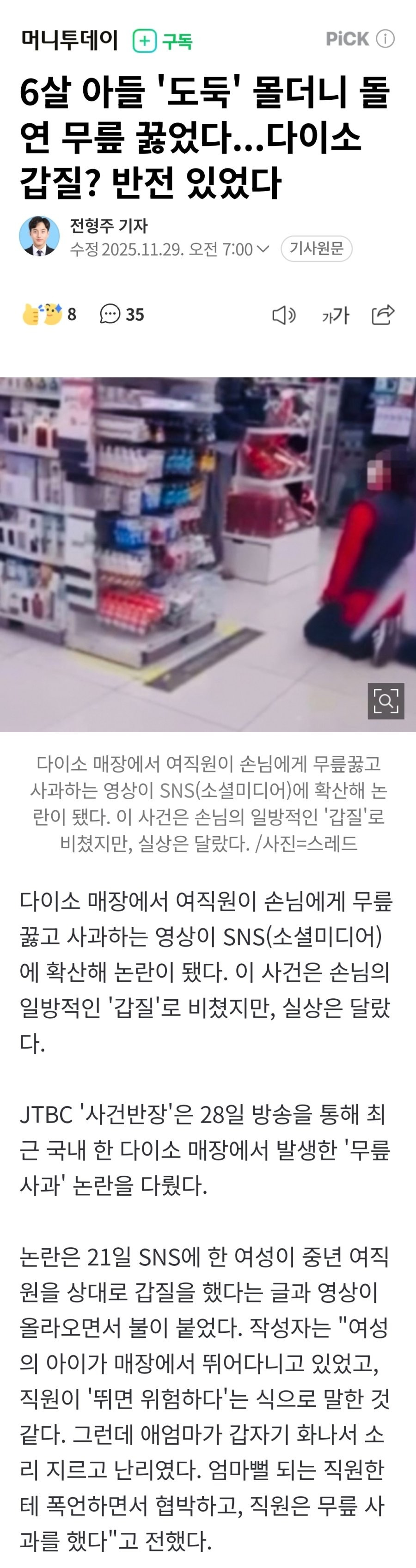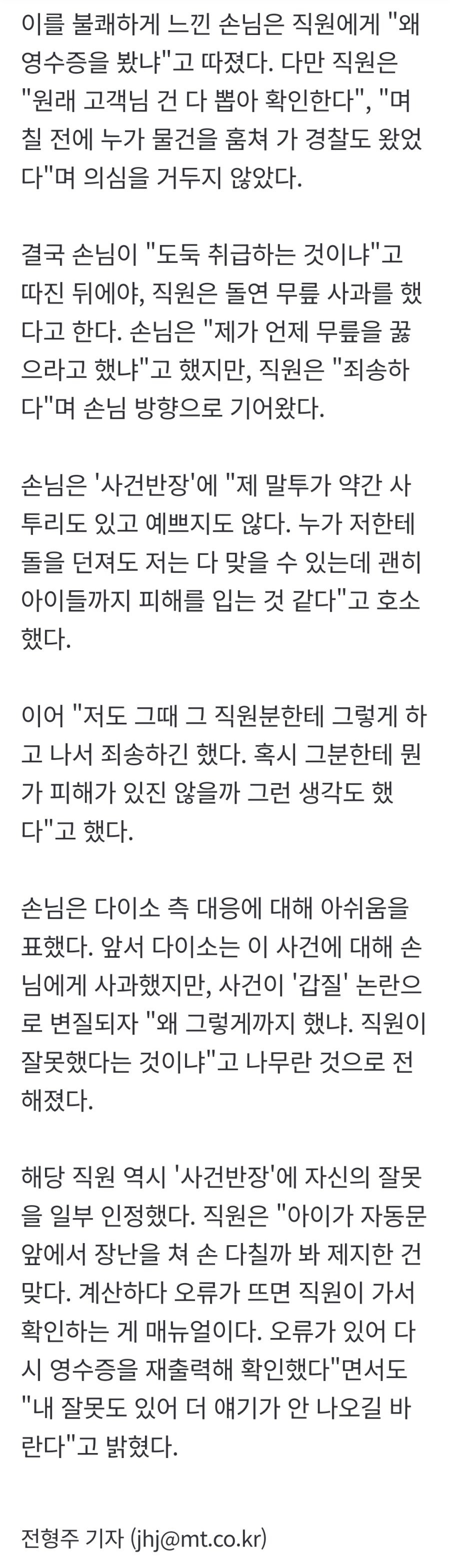 [스크랩] [기타]다이소 갑질 사건 반전 있었다. 작성자올림샵|작성시간25.12.02|조회수25,136 목록 댓글 51 글자크기 작게가 글자크기 크게가 다음검색 스크랩 원문 : 이종격투기 현재 게시글 추가 기능 열기 북마크 공유하기 신고 센터로 신고 댓글 댓글 51 댓글쓰기 답글쓰기 댓글 리스트 작성자공손곰돌이 | 작성시간 25.12.02 '도둑몰이'라는 자극적인 단어로 반전을 꾀했으나.... 작성자딥치즈 베이컨 포테이토 | 작성시간 25.12.02 다 읽어도 반전이 없는데요 작성자김치프라이스 | 작성시간 25.12.02 반전 없고 논점흐리기만 있을뿐ㅋㅋ 작성자uld5iq | 작성시간 25.12.03 으응..? 작성자포포포포미닛 | 작성시간 25.12.09 갑자기 무릎을꿇었다..? 댓글 전체보기