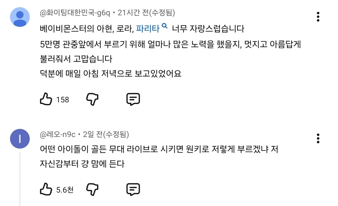 작성자혼란하다혼란해 작성시간 25.12.02 저런 특별무대는 대부분 립싱크인 인상이 있었음... 영상 보고 감격함..